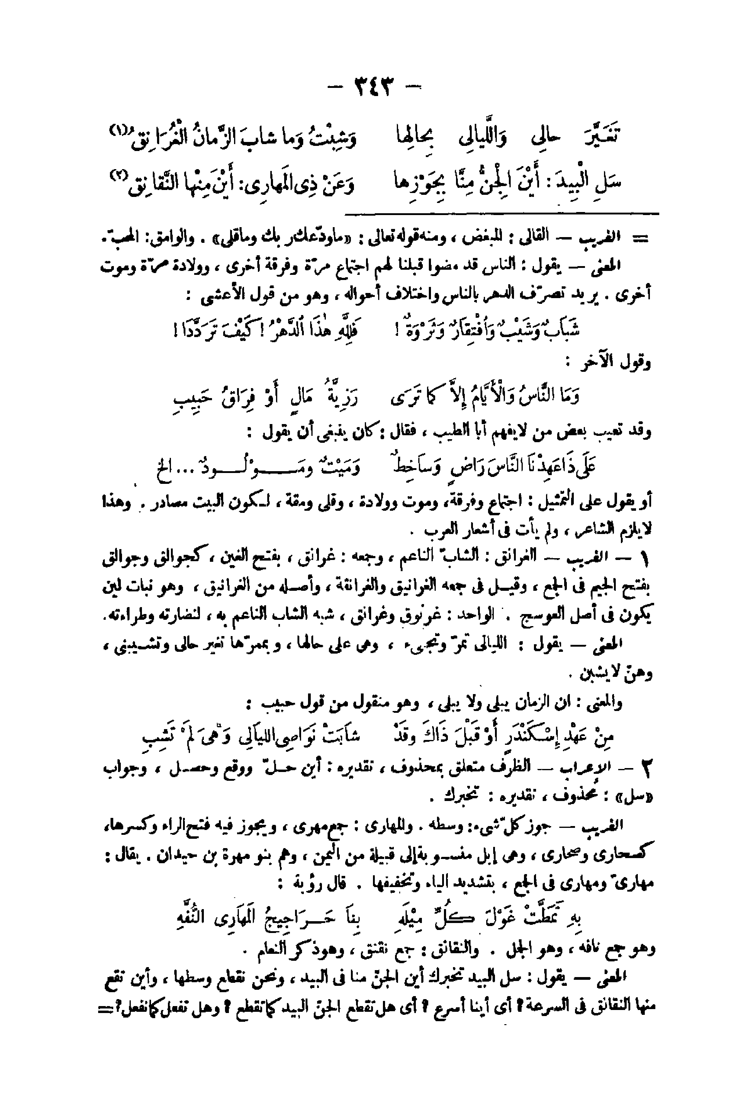 - الْغَرِيب الغرانق الشَّاب الناعم وَجمعه غرانق بِفَتْح الْغَيْن كجوالق وجوالق بِفَتْح الْجِيم فى الْجمع وَقيل فى جمعه الغرانيق والغرانقة وَأَصله من الغرانيق وَهُوَ نَبَات لين يكون فى أصل العوسج الْوَاحِد غرنوق وغرانق شبه الشَّاب الناعم بِهِ لنضارته وطراءته الْمَعْنى يَقُول الليالى تمر وتجئ وهى على حَالهَا وبمرها تغير حالى وتشيبنى وَهن لَا يشبن وَالْمعْنَى أَن الزَّمَان يبْلى وَلَا يبْلى وَهُوَ مَنْقُول من قَول حبيب
