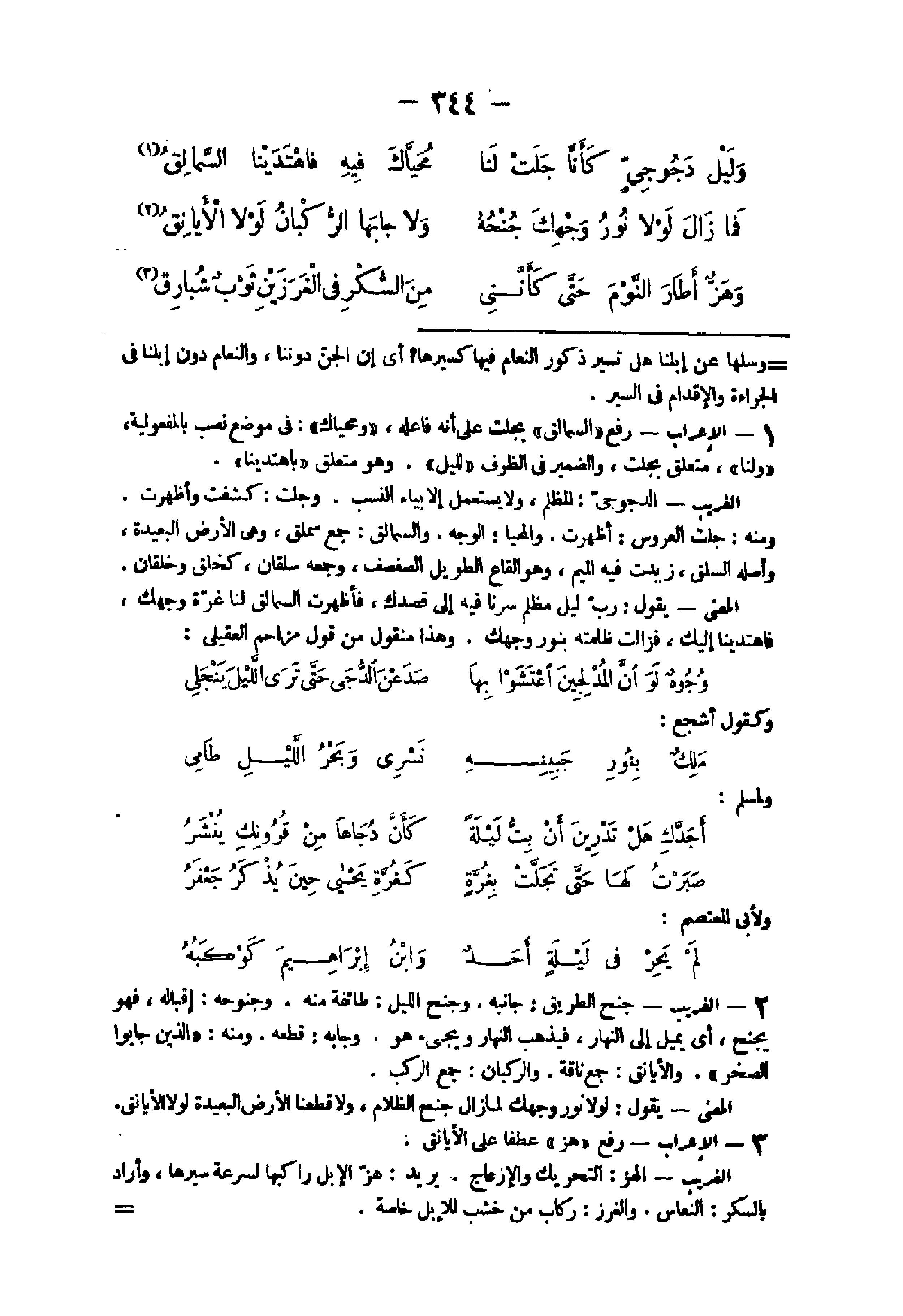 - الْإِعْرَاب رفع السمالق بجلت على أَنه فَاعله ومحياك فى مَوضِع نصب بالمفعولية وَلنَا مُتَعَلق بجلست وَالضَّمِير فى الظّرْف لِليْل وَهُوَ مُتَعَلق باهتدينا الْغَرِيب الدجوجى المظلم وَلَا يسْتَعْمل إِلَّا بياء النّسَب وجلت كشفت وأظهرت وَمِنْه جلت الْعَرُوس أظهرت والمحيا الْوَجْه والسمالق جمع سملق وهى الأَرْض الْبَعِيدَة وَأَصله السلق زيدت فِيهِ الْمِيم وَهُوَ القاع الطَّوِيل الصفصف وَجمعه سلقان كخلق وخلقان الْمَعْنى يَقُول رب ليل مظلم سرنا فِيهِ إِلَى قصدك فأظهرت السمالق لنا غرَّة وَجهك فاهتدينا إِلَيْك فَزَالَتْ ظلمته بِنور وَجهك وَهَذَا مَنْقُول من قَول مُزَاحم العقيلى