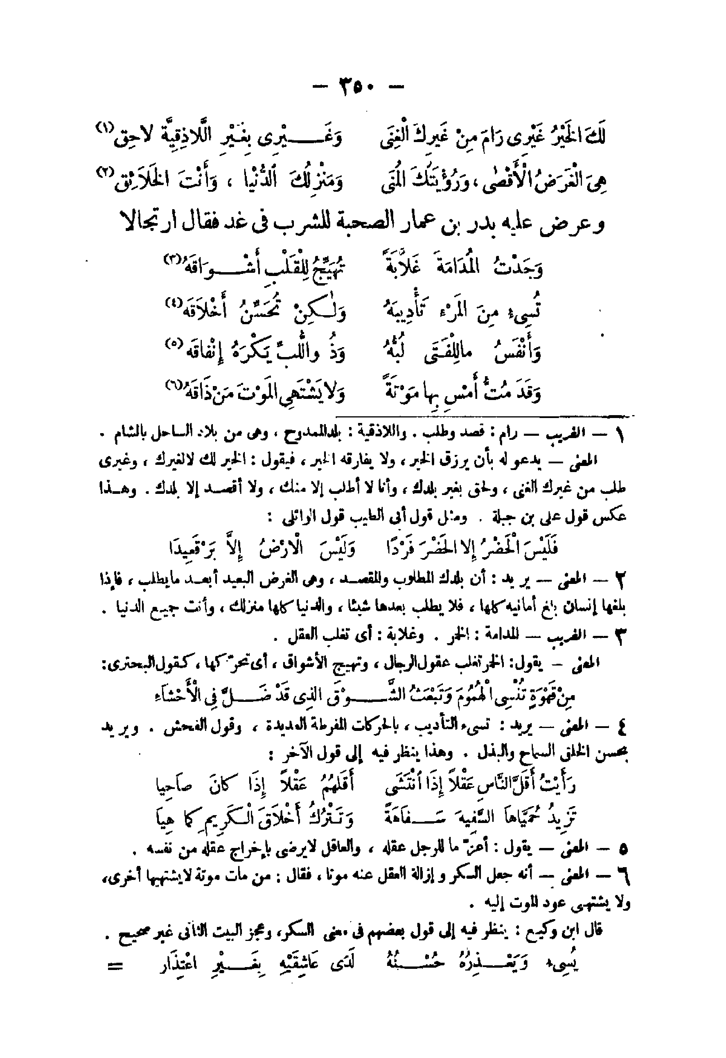 4 - الْمَعْنى أَنه جعل السكر وَإِزَالَة الْعقل عَنهُ موتا فَقَالَ من مَاتَ موتَة لَا يشتهيها أُخْرَى وَلَا يشتهى عود الْمَوْت إِلَيْهِ قَالَ ابْن وَكِيع ينظر فِيهِ إِلَى قَول بَعضهم فى معنى السكر وَعجز الْبَيْت الثانى // غير صَحِيح //