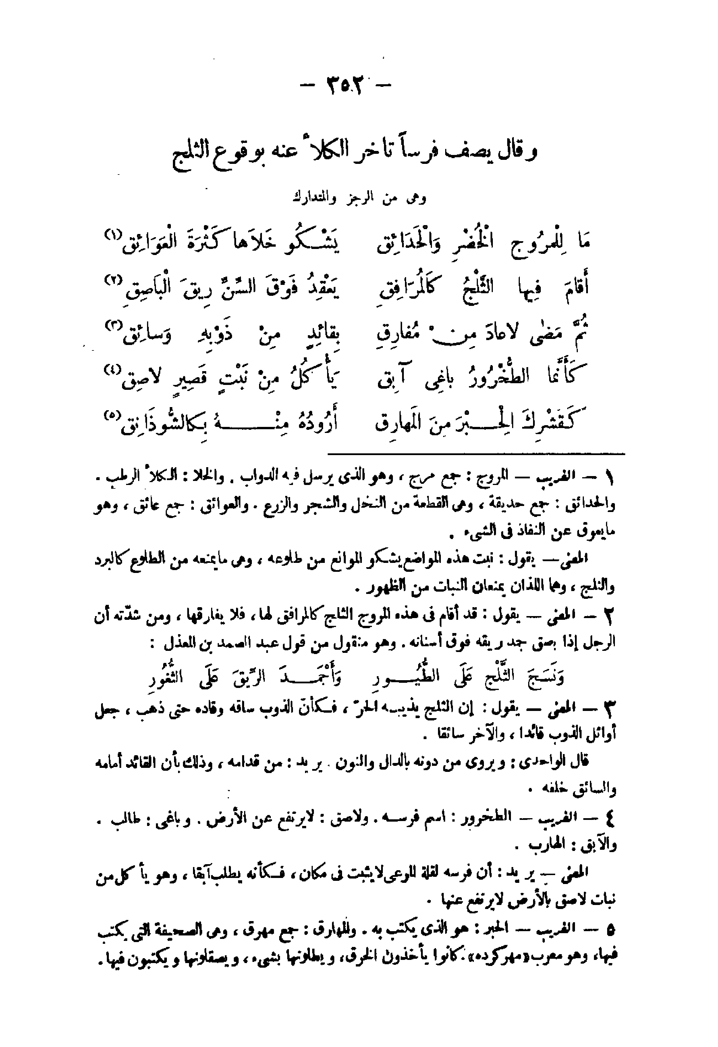 5 - الْغَرِيب الحبر هُوَ الذى يكْتب بِهِ والمهارق جمع مهرق وهى الصَّحِيفَة الَّتِى يكْتب فِيهَا وَهُوَ مُعرب مهر كرده كَانُوا يَأْخُذُونَ الْخرق ويطلونها بشئ والشوذانق مُعرب وَهُوَ الشاهين وَهُوَ نصف البازى من قَول الْعَجم سه دانك أى نصل دِرْهَم فَكَأَنَّهُ نصف البازى الْإِعْرَاب الضَّمِير فى أروده للنبات وَأدْخل الْبَاء على كَاف التَّشْبِيه لِأَنَّهَا تَأْوِيل الِاسْم أى بِمثل الشوذائق فى خفته وحركته وَأَرَادَ أرود فِيهِ فَحذف حرف الْجَرّ الْمَعْنى شبه النبت الْقصير اللاصق بِالْأَرْضِ ورعى فرسه فِيهِ بالحبر يقشر عَن الصَّحِيفَة فَهُوَ يذهب ويجئ فِيهِ لقلته فَكَأَنَّهُ يقشر خطا عَن صحيفَة وَهُوَ // تَشْبِيه جيد //