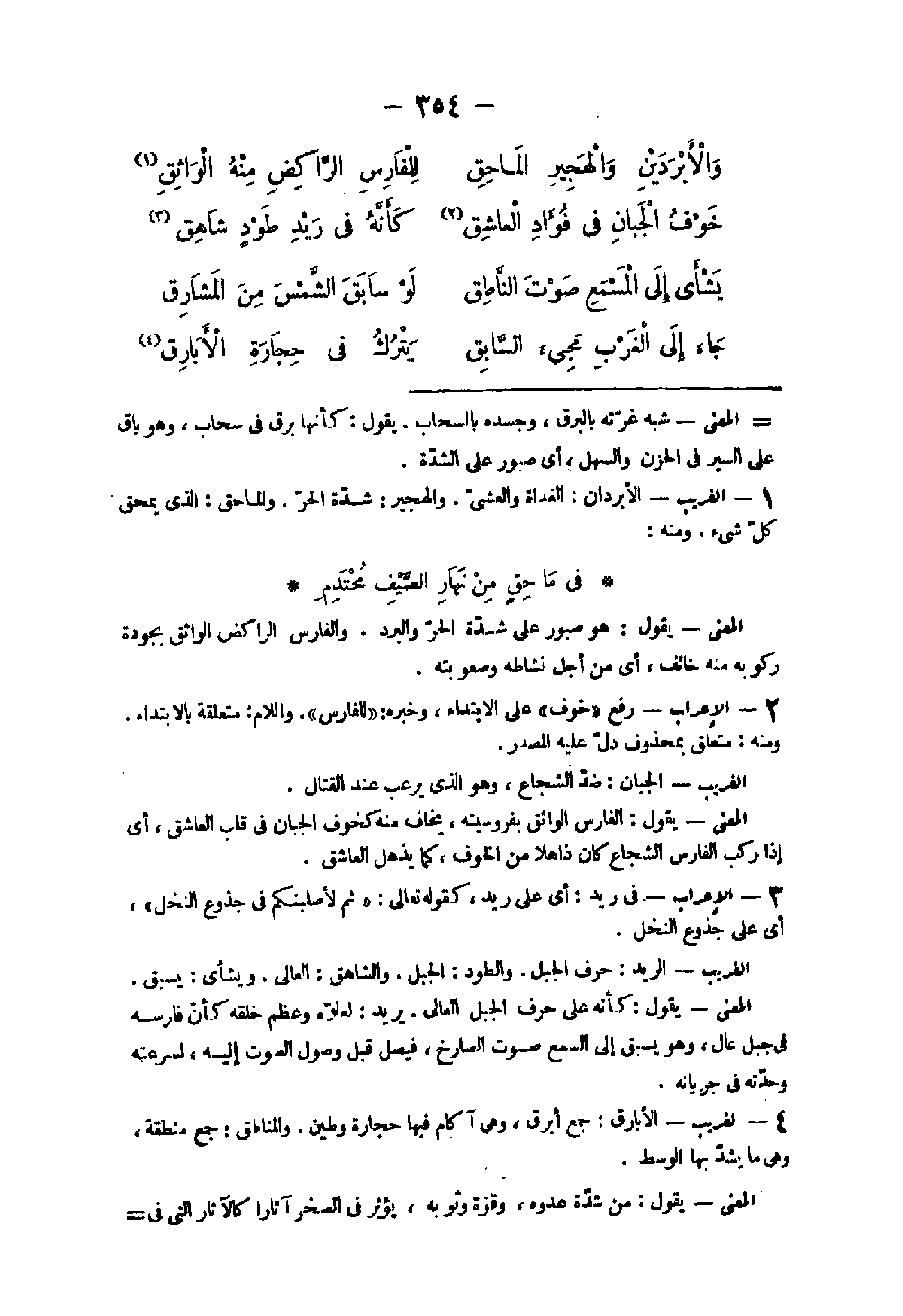 13 - الْغَرِيب الأبارق جمع أبرق وهى آكام فِيهَا حِجَارَة وطين والمناطق جمع منْطقَة وهى مَا يشد بهَا الْوسط الْمَعْنى يَقُول من شدَّة عدوه وَقُوَّة وثوبه يُؤثر فى الصخر آثارا كالآثار الَّتِى فى سيور المنطقة من الحلى إِذا قلع مِنْهَا وَهُوَ // تَشْبِيه حسن // وَهُوَ مَنْقُول من قَول أَبى المعتصم