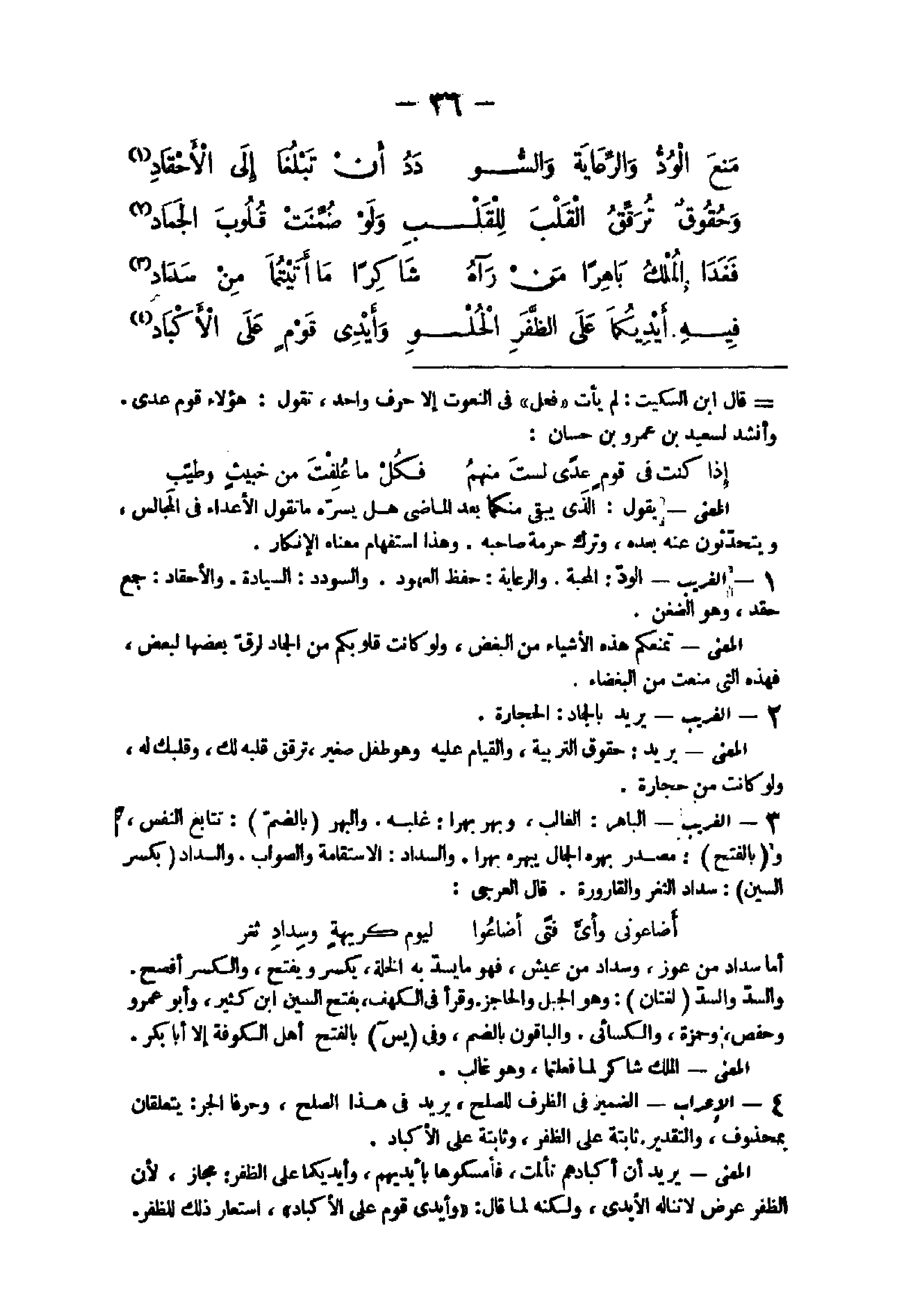 - الْغَرِيب الود الْمحبَّة وَالرِّعَايَة حفظ العهود والسودد السِّيَادَة والأحقاد جمع حقد وَهُوَ الضغن الْمَعْنى تمنعكم هَذِه الْأَشْيَاء من البغض وَلَو كَانَت قُلُوبكُمْ من الجماد لرق بَعْضهَا لبَعض فَهَذِهِ الَّتِى منعت من الْبغضَاء