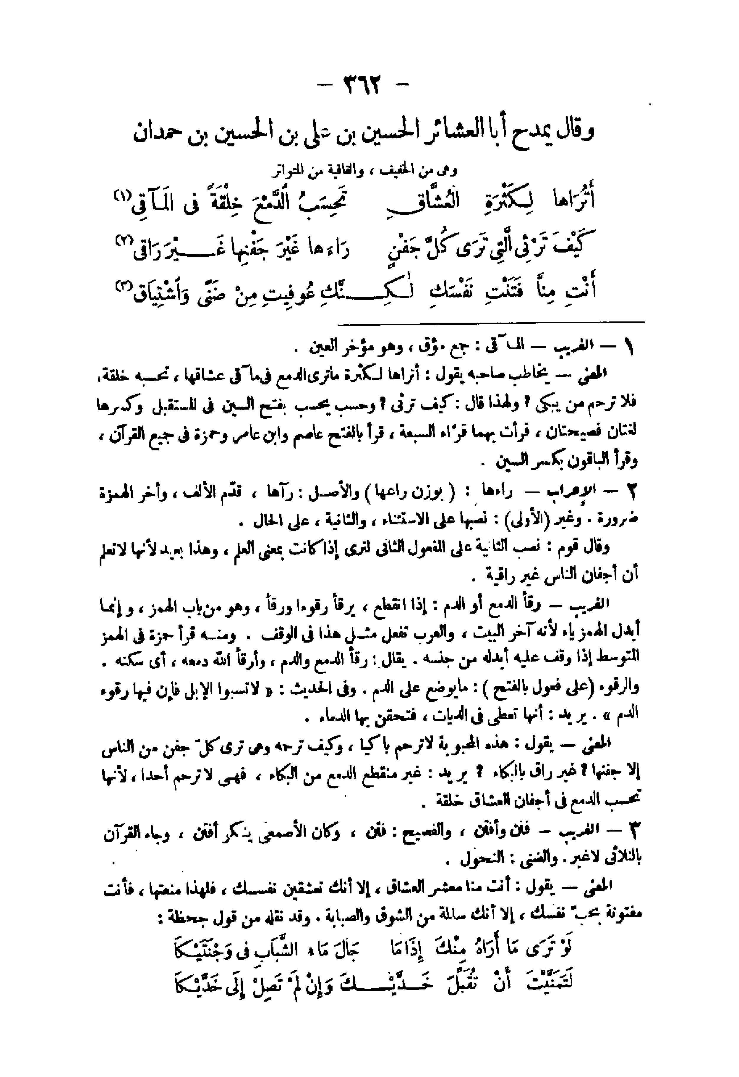 - 1 - الْغَرِيب المآقى جمع مؤق وَهُوَ مُؤخر الْعين الْمَعْنى يُخَاطب صَاحبه يَقُول أتراها لِكَثْرَة مَا ترى الدمع فى مآقى عشاقها تحسبه خلقَة فَلَا ترحم من يبكى وَلِهَذَا قَالَ كف ترثى وَحسب يحْسب بِفَتْح السِّين فى الْمُسْتَقْبل وَكسرهَا لُغَتَانِ فصيحتان قَرَأت بهما قراء السَّبْعَة قَرَأَ بِالْفَتْح عَاصِم وَابْن عَامر وَحَمْزَة فى جَمِيع الْقُرْآن وَقَرَأَ الْبَاقُونَ بِكَسْر السِّين