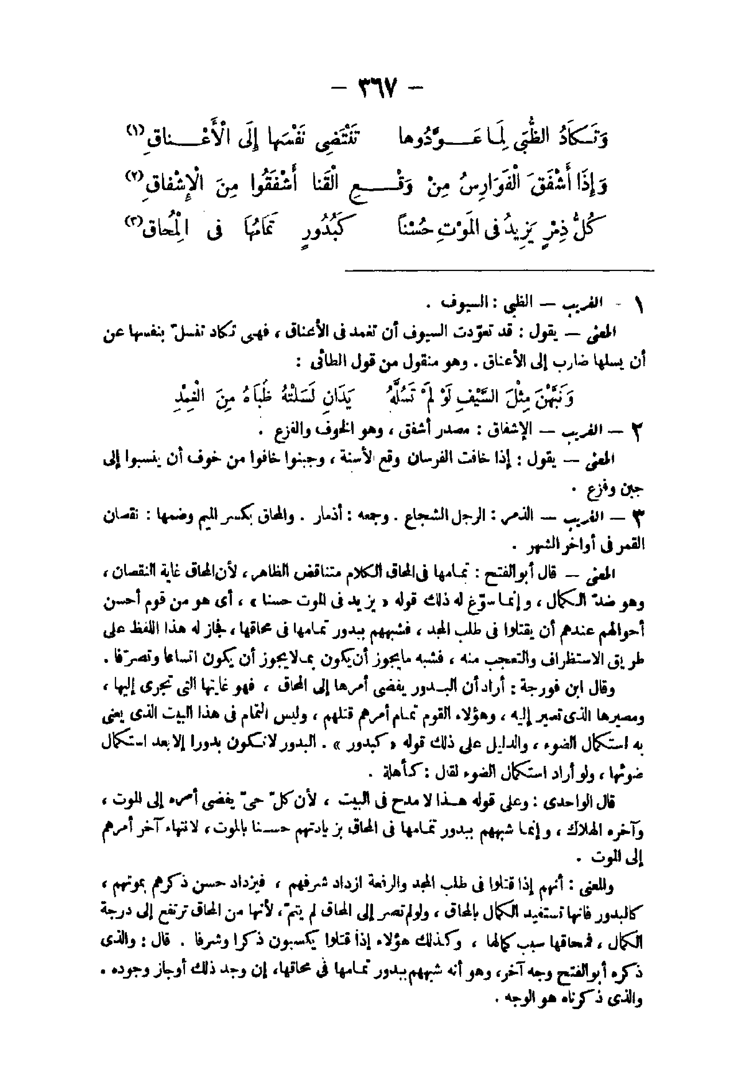 أى هُوَ من قوم أحسن أَحْوَالهم عِنْدهم أَن يقتلُوا فى طلب الْمجد فشبههم ببدور تَمامهَا فى محاقها فَجَاز لَهُ هَذَا اللَّفْظ على طَرِيق الاستظراف والتعجب مِنْهُ فَشبه مَا يجوز ان يكون بِمَا لَا يجوز أَن يكون اتساعا وتصرفا وَقَالَ ابْن فورجة أَرَادَ أَن البدور يفضى امرها إِلَى المحاق فَهُوَ غايتها الَّتِى تجرى إِلَيْهَا ومصيرها الذى تصير إِلَيْهِ وَهَؤُلَاء الْقَوْم تَمام أَمرهم قَتلهمْ وَلَيْسَ التَّمام فى هَذَا الْبَيْت الذى يعْنى بِهِ استكمال الضَّوْء وَالدَّلِيل على ذَلِك قَوْله كبدور البدور لَا تكون بدور إِلَّا بعد استكمال ضوئها وَلَو أَرَادَ استكمال الضَّوْء لقَالَ كأهلة قَالَ الواحدى وعَلى قَوْله هَذَا لَا مدح فى الْبَيْت لِأَن كل حى يفضى أمره إِلَى الْمَوْت وَآخره الْهَلَاك وَإِنَّمَا شبههم ببدور تَمامهَا فى المحاق بزيادتهم حسنا بِالْمَوْتِ لانْتِهَاء آخر أَمرهم إِلَى الْمَوْت وَالْمعْنَى أَنهم إِذا قتلوا فى طلب الْمجد والرفعة ازْدَادَ شرفهم فَيَزْدَاد حسن ذكرهم بموتهم كالبدور فَإِنَّهَا تستفيد الْكَمَال بالمحاق وَلَو لم تصر إِلَى المحاق لم يتم لِأَنَّهَا من المحاق ترْتَفع إِلَى دَرَجَة الْكَمَال فمحاقها سَبَب كمالها وَكَذَلِكَ هَؤُلَاءِ إِذا قتلوا يَكْسِبُونَ ذكرا وشرفا قَالَ والذى ذكره أَبُو الْفَتْح وَجه آخر وَهُوَ أَنه شبههم ببدور تَمامهَا فى محاقها إِن وجد ذَلِك أَو جَازَ وجوده والذى ذَكرْنَاهُ هُوَ الْوَجْه