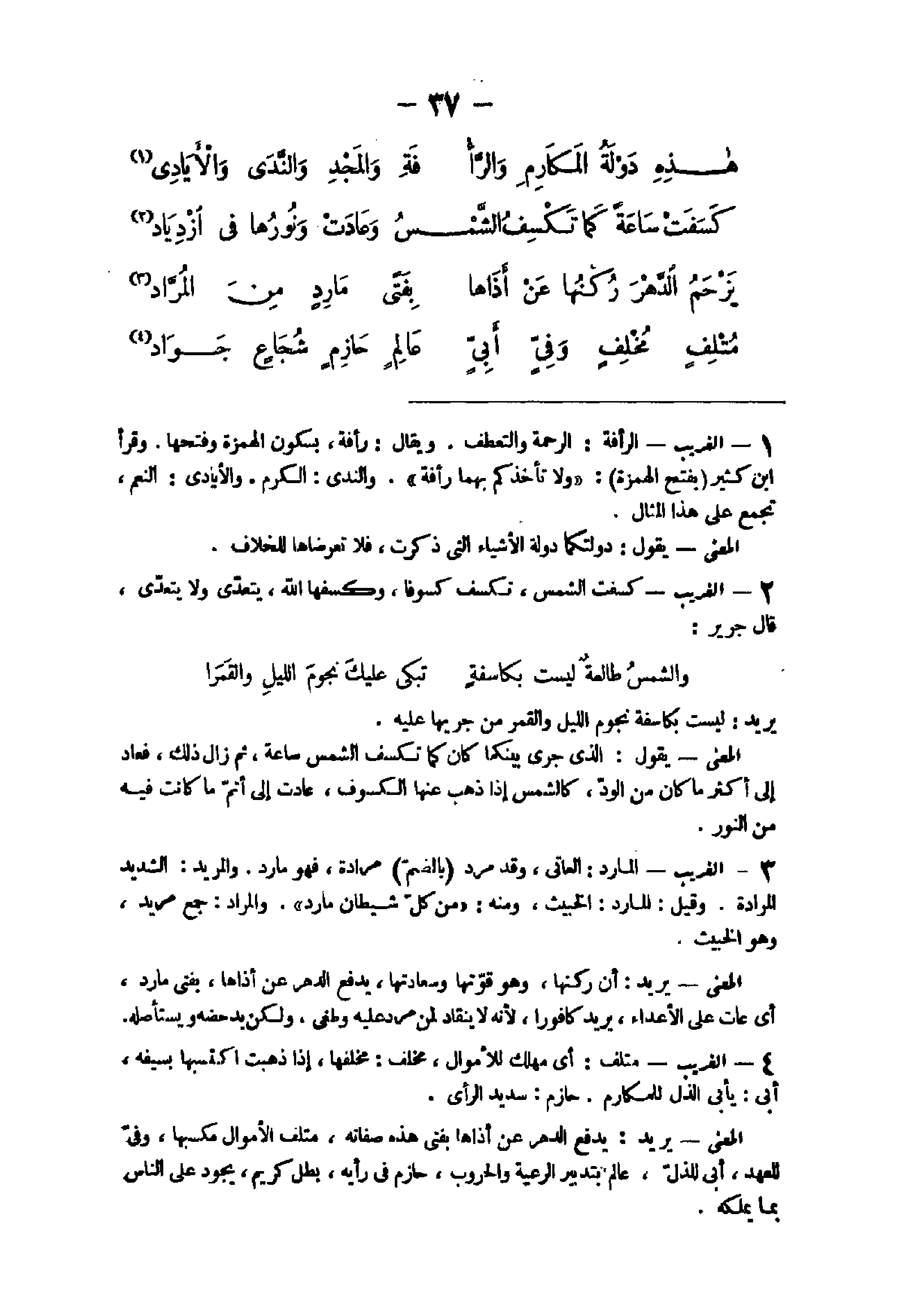 26 - الْغَرِيب متْلف أى مهلك للأموال مخلف مخلفها إِذا ذهبت اكتسبها بِسَيْفِهِ أَبى يَأْبَى الذل للمكارم حَازِم سديد الرأى الْمَعْنى يُرِيد يدْفع الدَّهْر عَن أذاها بفتى هَذِه صِفَاته متْلف الْأَمْوَال مكسبها وفى للْعهد أَبى للذل عَالم بتدبير الرّعية والحروب حَازِم فى رَأْيه بَطل كريم يجود على النَّاس بِمَا يملكهُ