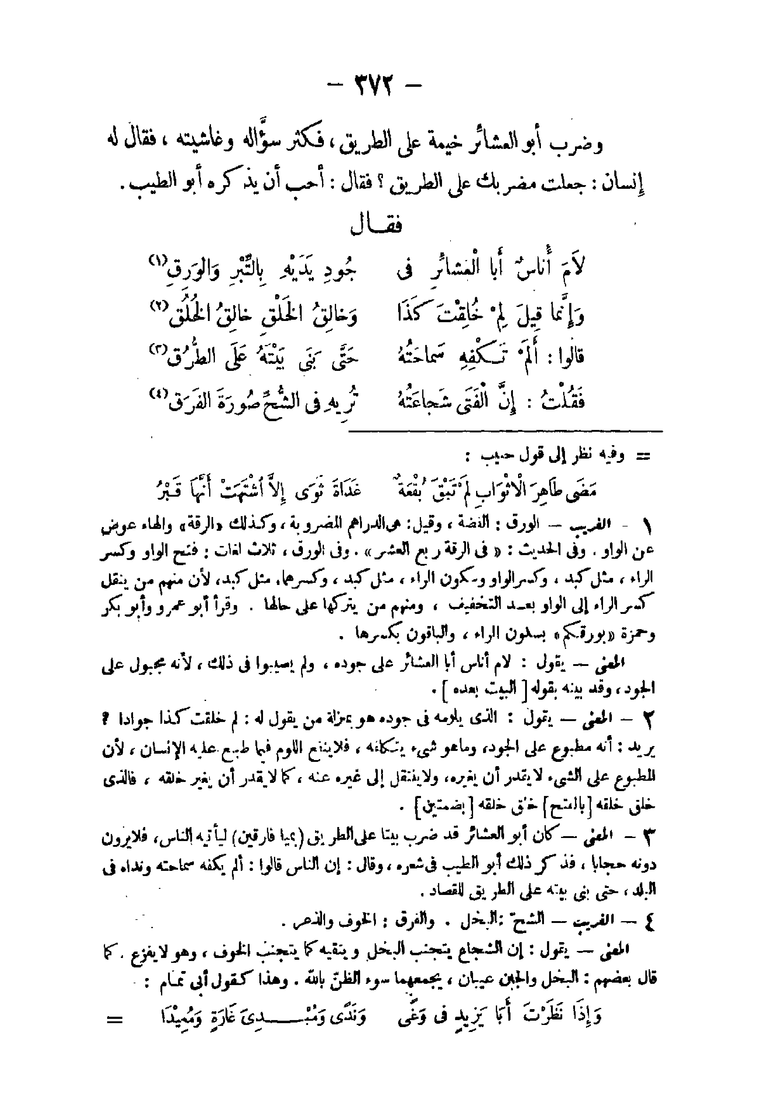 - 1 - الْغَرِيب الْوَرق الْفضة وَقيل هى الدَّرَاهِم المضروبة وَكَذَلِكَ الرقة وَالْهَاء عوض عَن الْوَاو وفى الحَدِيث " فى الرقة ربع الْعشْر " وفى الْوَرق ثَلَاث لُغَات فتح الْوَاو وَكسر الرَّاء مثل كبد وَكسر الْوَاو وَسُكُون الرَّاء مثل كبد وكسرهما مثل كبد لِأَن مِنْهُم من ينْقل كسر الرَّاء إِلَى الْوَاو بعد التَّخْفِيف وَمِنْهُم من يَتْرُكهَا على حَالهَا وَقَرَأَ أَبُو عَمْرو وَأَبُو بكر وَحَمْزَة بورقكم بِسُكُون الرَّاء وَالْبَاقُونَ بِكَسْرِهَا الْمَعْنى يَقُول لَام أنَاس أَبَا العشائر على جوده وَلم يُصِيبُوا فى ذَلِك لِأَنَّهُ مجبول على الْجُود وَقد بَينه بقوله الْبَيْت بعده