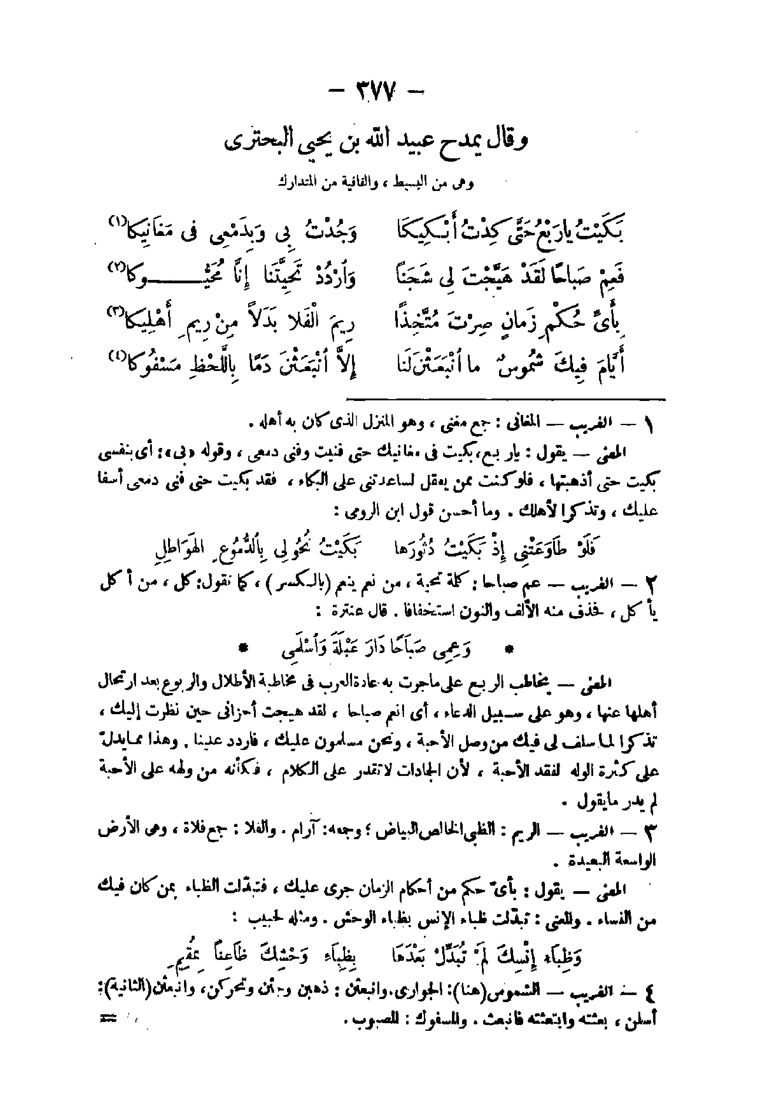 - 1 - الْغَرِيب المغانى جمع مغنى وَهُوَ الْمنزل الذى كَانَ بِهِ أَهله الْمَعْنى يَقُول يَا ربع بَكَيْت فى مغانيك حَتَّى فنيت وفنى دمعى وَقَوله بى أى بنفسى بَكَيْت حَتَّى أذهبتها فَلَو كنت مِمَّن يعقل لساعدتنى على الْبكاء فقد بَكَيْت حَتَّى فى دمعى أسفا عَلَيْك وتذكرا لأهْلك وَمَا أحسن قَول ابْن الرومى