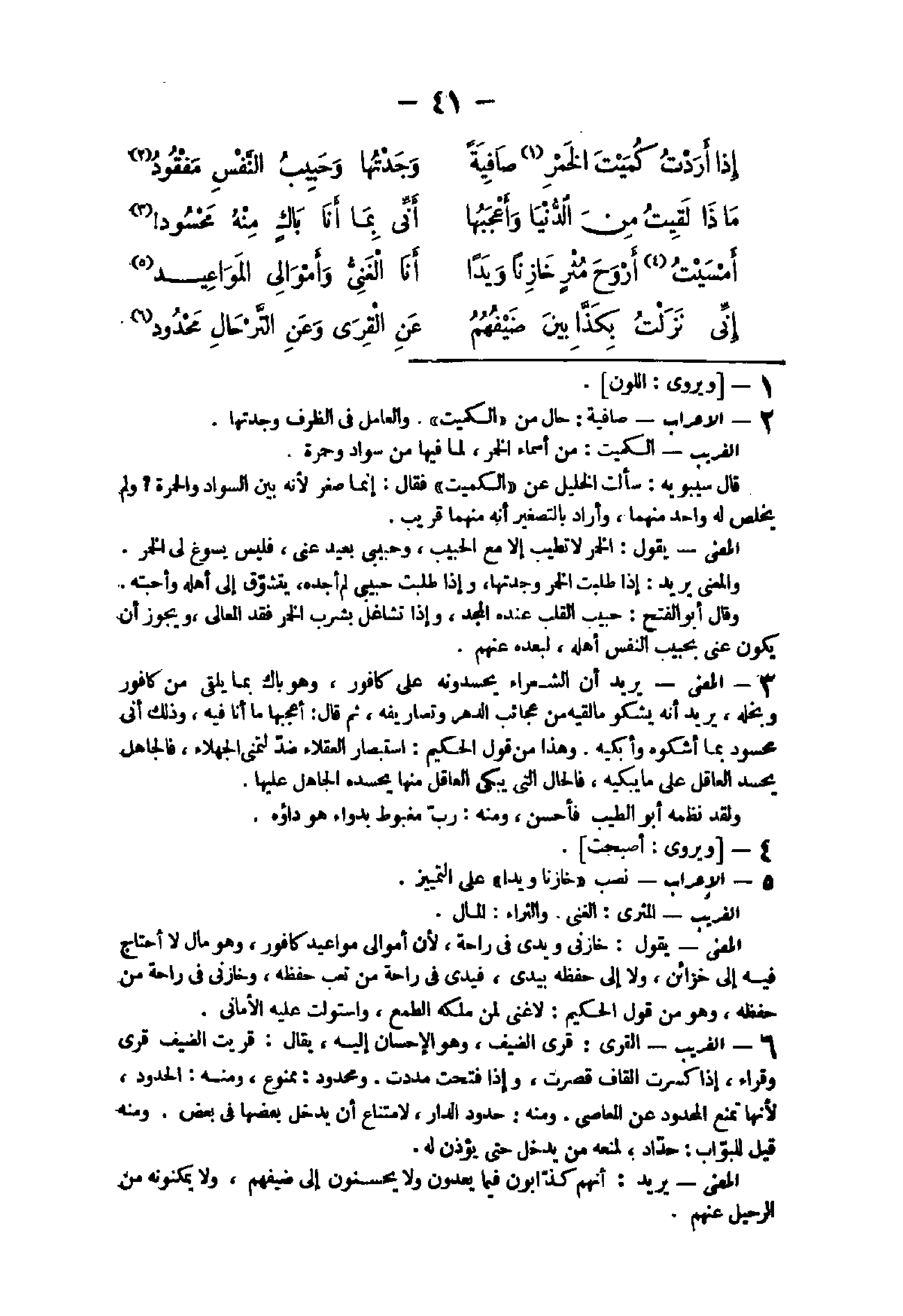 - الْإِعْرَاب صَافِيَة حَال من الْكُمَيْت وَالْعَامِل فى الظّرْف وَجدتهَا الْغَرِيب الْكُمَيْت من أَسمَاء الْخمر لما فِيهَا من سَواد وَحُمرَة قَالَ سِيبَوَيْهٍ سَأَلت الْخَلِيل عَن الْكُمَيْت فَقَالَ إِنَّمَا صغر لِأَنَّهُ بَين السوَاد والحمرة وَلم يخلص لَهُ وَاحِد مِنْهُمَا وَأَرَادَ بِالتَّصْغِيرِ أَنه مِنْهُمَا قريب الْمَعْنى يَقُول الْخمر لَا تطيب إِلَّا مَعَ الحبيب وحبيبى بعيد عَنى فَلَيْسَ يسوغ لى الْخمر وَالْمعْنَى يُرِيد إِذا طلبت الْخمر وَجدتهَا وَإِذا طلبت حبيبى لم أَجِدهُ يتشوق إِلَى أَهله وأحبته وَقَالَ أَبُو الْفَتْح حبيب الْقلب عِنْده الْمجد وَإِذا تشاغل بِشرب الْخمر فقد المعالى وَيجوز أَن يكون عَنى بحبيب النَّفس أَهله لبعده عَنْهُم