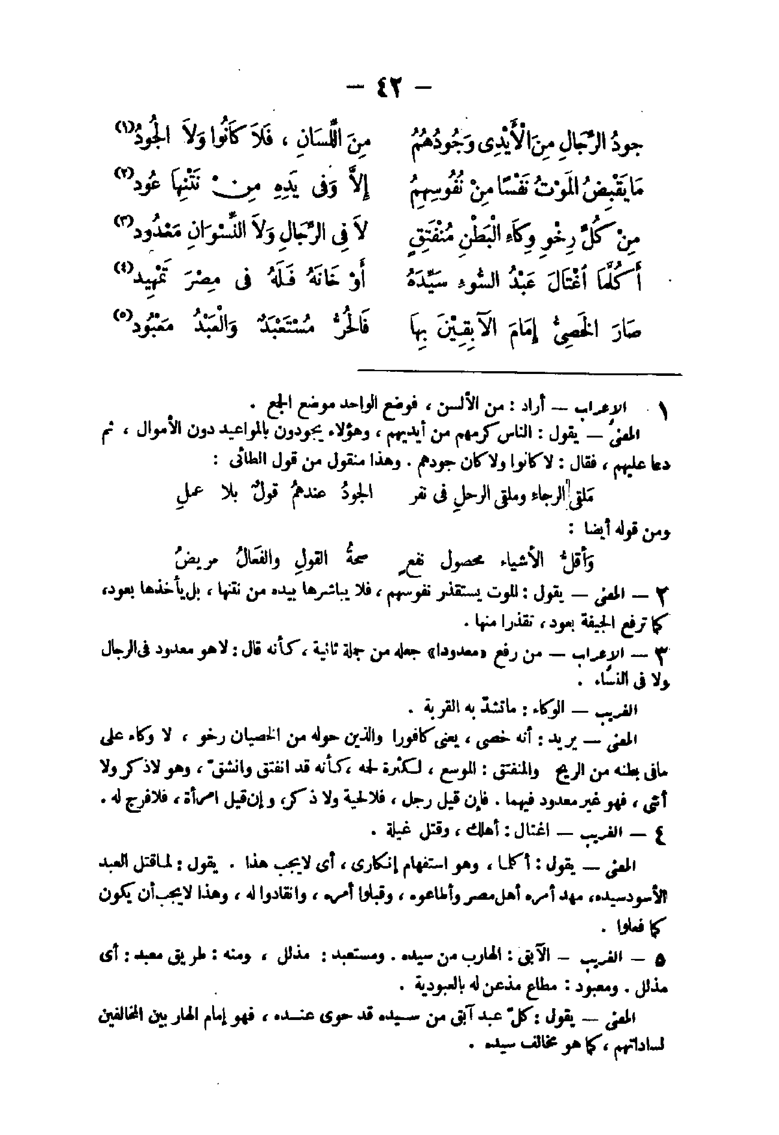 - الْإِعْرَاب أَرَادَ من الألسن فَوضع الْوَاحِد مَوضِع الْجمع الْمَعْنى يَقُول النَّاس كرمهم من أَيْديهم وَهَؤُلَاء يجودون بالمواعيد دون الْأَمْوَال ثمَّ دَعَا عَلَيْهِم فَقَالَ لَا كَانُوا وَلَا كَانَ جودهم وَهَذَا مَنْقُول من قَول الطائى