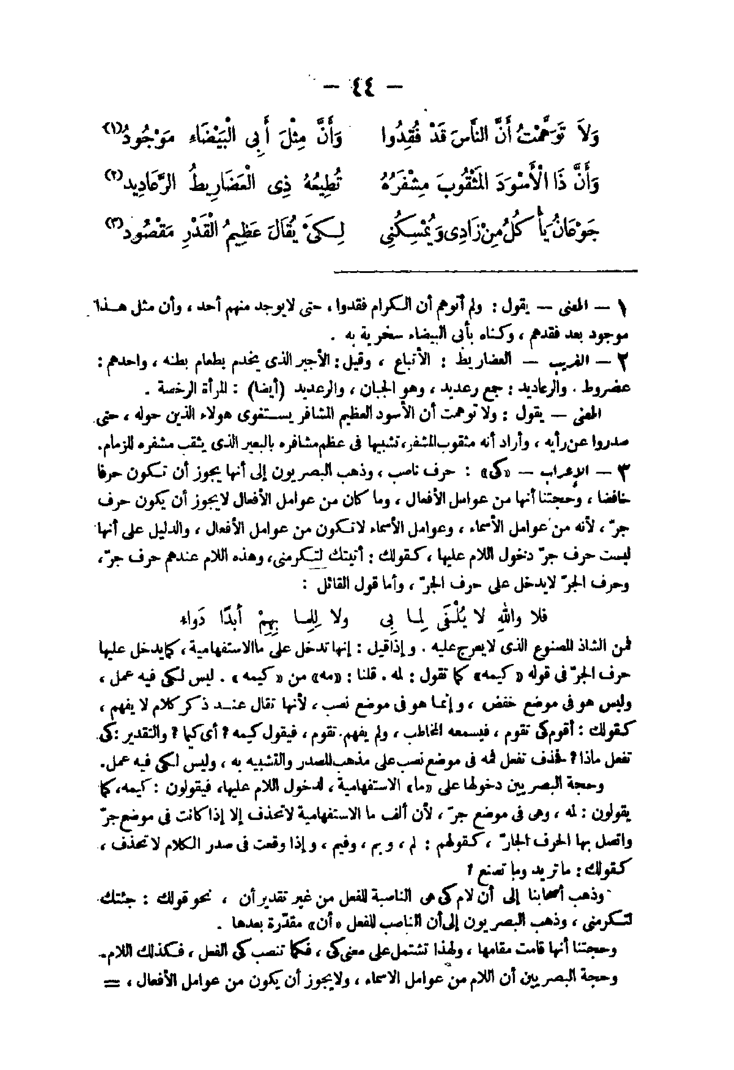 فَمن الشاذ الْمَصْنُوع الذى لَا يعرج عَلَيْهِ وَإِذا قيل إِنَّهَا تدخل على مَا الاستفهامية كَمَا يدْخل عَلَيْهَا حرف الْجَرّ فى قَوْله كيمه كَمَا تَقول لمه قُلْنَا مَه من كيمه لَيْسَ لكى فِيهِ عمل وَلَيْسَ هُوَ فى مَوضِع خفض وَإِنَّمَا هُوَ فى مَوضِع نصب لِأَنَّهَا تقال عِنْد ذكر كَلَام لَا يفهم كَقَوْلِك أقوم كى تقوم فيسمعه الْمُخَاطب وَلم يفهم تقوم فَيَقُول كيمه أى كَيْمَا وَالتَّقْدِير كى تفعل مَاذَا فَحذف تفعل فَمه فى مَوضِع نصب على مَذْهَب الْمصدر والتشبيه بِهِ وَلَيْسَ لكى فِيهِ عمل وَحجَّة الْبَصرِيين دُخُولهَا على مَا الاستفهامية لدُخُول اللَّام عَلَيْهَا فَيَقُولُونَ كيمه كَمَا يَقُولُونَ لمه وهى فى مَوضِع جر لِأَن ألف مَا الاستفهامية لَا نحذف إِلَّا إِذا كَانَت فى مَوضِع جر واتصل بهَا الْحَرْف الْجَار كَقَوْلِهِم لم وَبِمَ وفيم وَإِذا وَقعت فى صدر الْكَلَام لَا تحذف كَقَوْلِك مَا تُرِيدُ وَمَا تصنع وَذهب أَصْحَابنَا إِلَى أَن لَام كى هى الناصبة للْفِعْل من غير تَقْدِير أَن نَحْو قَوْلك جئْتُك لتكرمنى وَذهب البصريون إِلَى أَن الناصب للْفِعْل أَن مقدرَة بعْدهَا وَحجَّتنَا أَنَّهَا قَامَت مقَامهَا وَلِهَذَا تشْتَمل على معنى كى فَكَمَا تنصب كى الْفِعْل فَكَذَلِك اللَّام وَحجَّة الْبَصرِيين أَن اللَّام من عوامل الْأَسْمَاء وَلَا يجوز أَن يكون من عوامل الْأَفْعَال فَوَجَبَ أَن يكون الْفِعْل مَنْصُوبًا بِأَن مقدرَة لِأَنَّهَا تكون مَعَ الْفِعْل بِمَنْزِلَة الْمصدر الذى يحسن أَن يدْخل عَلَيْهِ حرف الْجَرّ هَذِه حجَّة حَسَنَة لَهُم الْغَرِيب يُقَال جَائِع وجوعان وَجمع جوعان جوعى وجياع وَجمع جَائِع جوع الْمَعْنى يُرِيد أَنه جَائِع أى هُوَ لبخله ولؤمه لَا يشبه من الطَّعَام وَقَوله