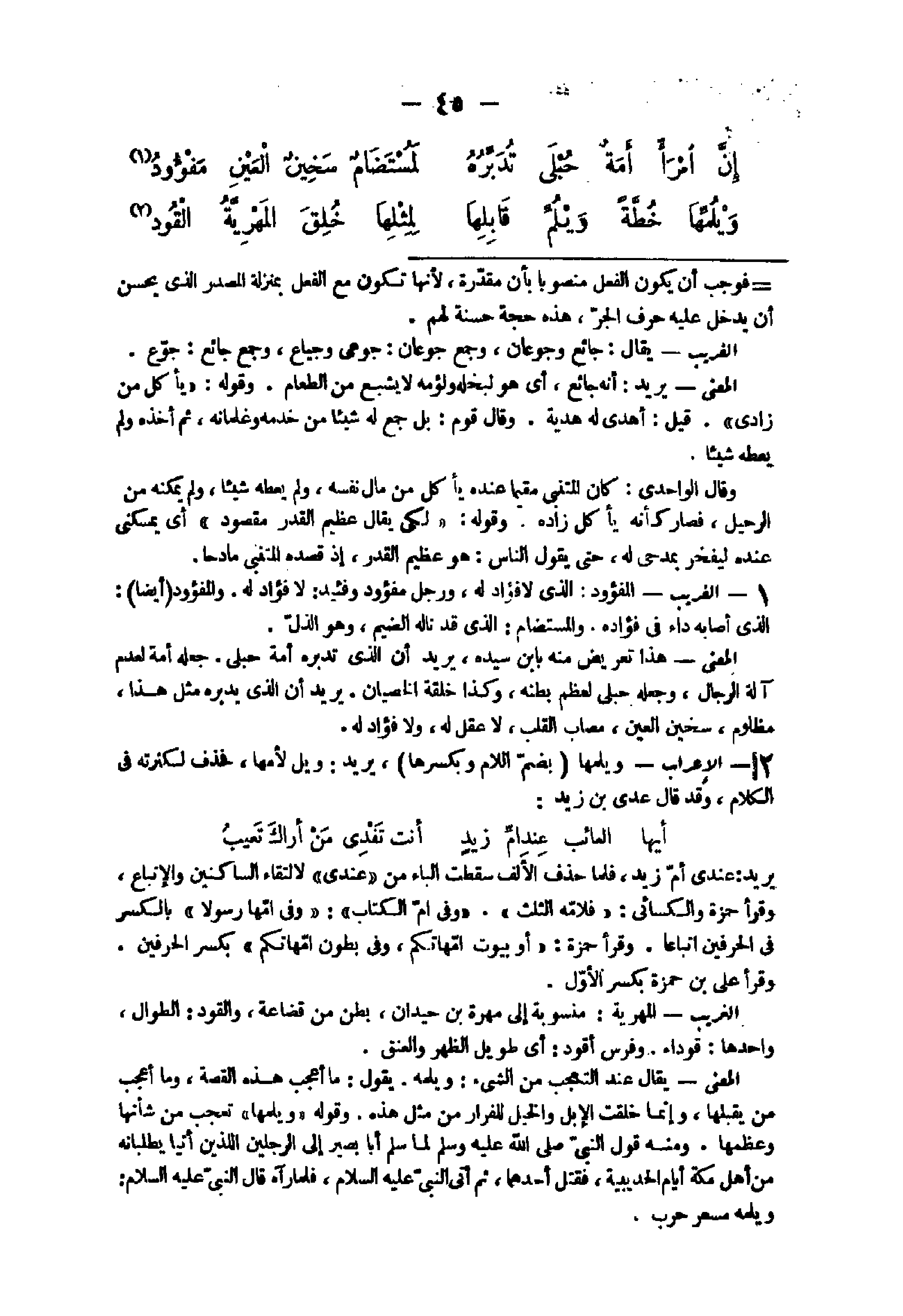 يُرِيد عندى أم زيد فَلَمَّا حذف الْألف سَقَطت الْيَاء من عندى لالتقاء الساكنين والإتباع وَقَرَأَ حَمْزَة والكسائى {فلأمه الثُّلُث} {وفى أم الْكتاب} وفى أمهَا رَسُولا بِالْكَسْرِ فى الحرفين إتباعا وَقَرَأَ حَمْزَة {أَو بيُوت آمهاتكم وفى بطُون أُمَّهَاتكُم} بِكَسْر الحرفين وَقَرَأَ على بن حَمْزَة بِكَسْر الأول الْغَرِيب المهرية منسوبة إِلَى مهرَة بن حيدان بطن من قضاعة والقود الطوَال وَاحِدهَا قوداء وَفرس أَقُود أى طَوِيل الظّهْر والعنق الْمَعْنى يُقَال عِنْد التَّعَجُّب من الشئ ويلمه يَقُول مَا أعجب هَذِه الْقِصَّة وَمَا أعجب من يقبلهَا وَإِنَّمَا خلقت الْإِبِل وَالْخَيْل للفرار من مثل هَذِه وَقَوله ويلمها تعجب من شَأْنهَا وعظمها وَمِنْه قَول النبى