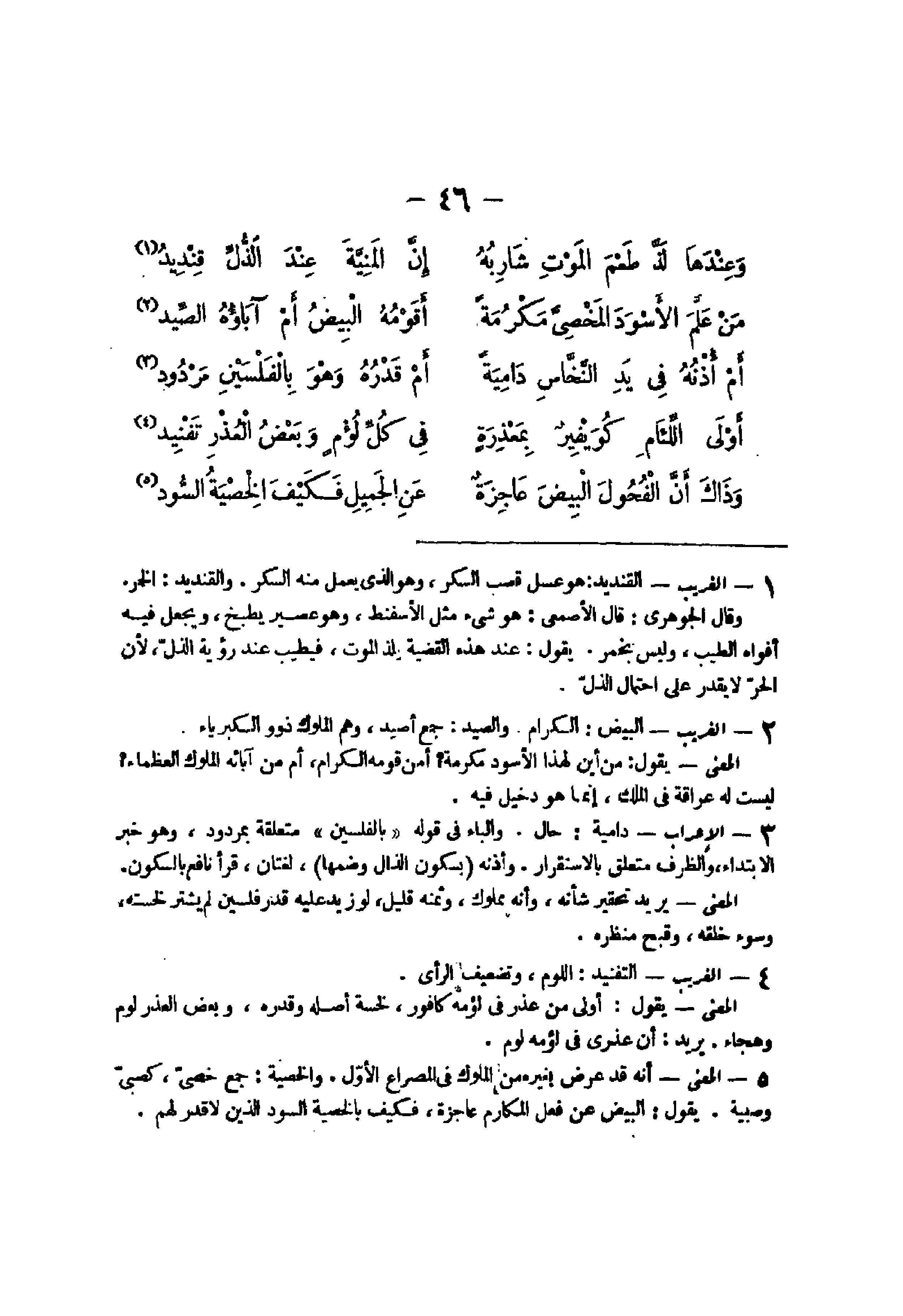 30 - الْمَعْنى أَنه قد عرض بِغَيْرِهِ من الْمُلُوك فى المصراع الأول والخصية جمع خصى كصبى وصبية يَقُول الْبيض عَن فعل المكارم عاجزة فَكيف بالخصية السود الَّذين لَا قدر لَهُم
