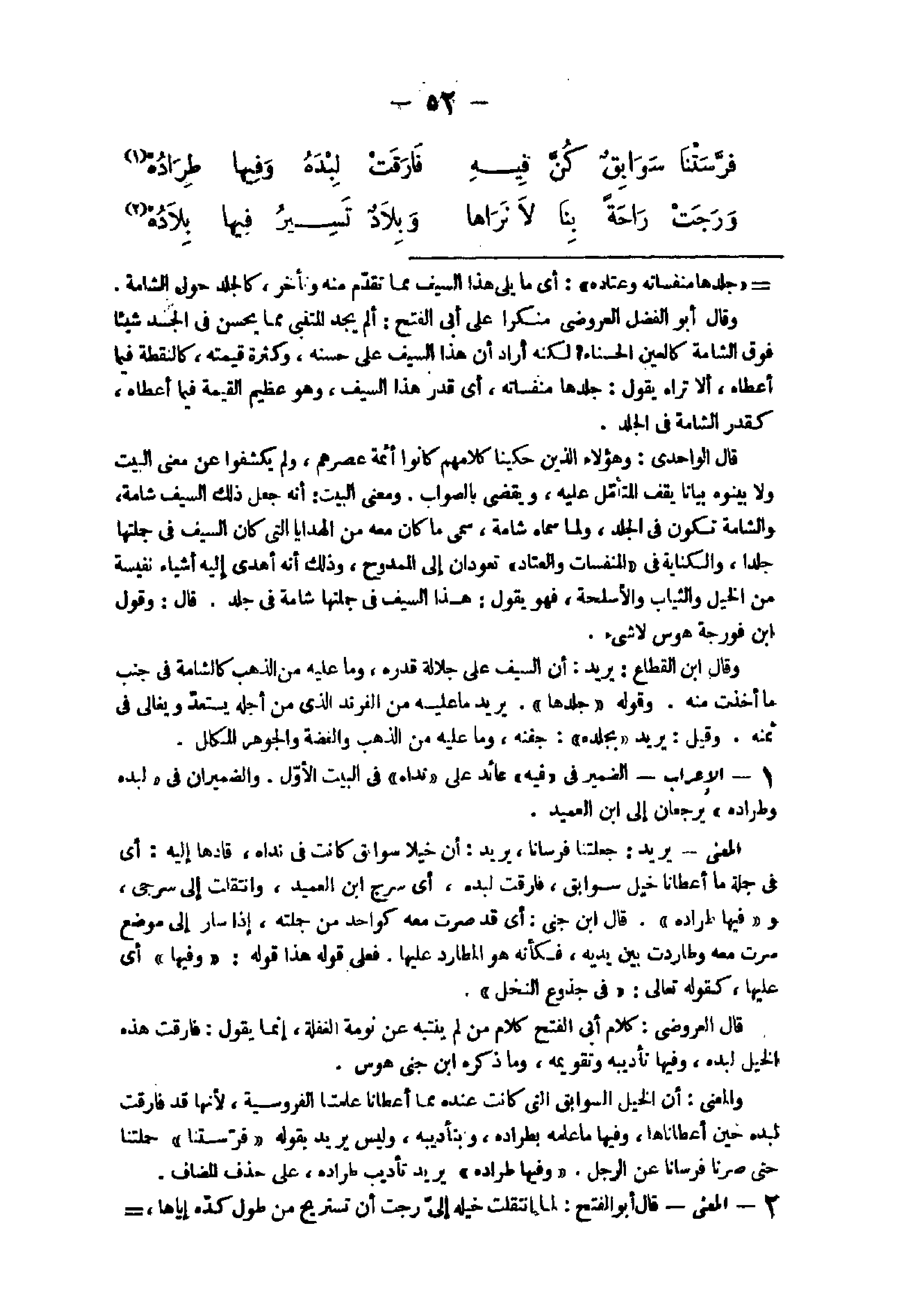 - الْإِعْرَاب الضَّمِير فى فِيهِ عَائِد على نداه فى الْبَيْت الأول والضميران فى لبده وطراده يرجعان إِلَى ابْن العميد الْمَعْنى يُرِيد جعلتنا فُرْسَانًا يُرِيد أَن خيلا سوابق كَانَت فى نداه قادها إِلَيْهِ أى فى جملَة مَا أَعْطَانَا خيل سوابق فَارَقت لبده أى سرج ابْن العميد وانتقلت إِلَى سرجى وفيهَا طراده قَالَ ابْن جنى أى قد صرت مَعَه كواحد من جملَته إِذا سَار إِلَى مَوضِع سرت مَعَه وطاردت بَين يَدَيْهِ فَكَأَنَّهُ هُوَ المطارد عَلَيْهَا فعلى قَوْله هَذَا قَوْله وفيهَا أى عَلَيْهَا كَقَوْلِه تَعَالَى {فِي جُذُوع النّخل} قَالَ العروضى كَلَام أَبى الْفَتْح كَلَام من لم ينتبه بعد عَن نومَة الْغَفْلَة إِنَّمَا يَقُول فَارَقت هَذِه الخبل لبده وَفِيمَا تأديبه وتقويمه وَمَا ذكره ابْن جنى هوس وَالْمعْنَى أَن الْخَيل السوابق الَّتِى كَانَت عِنْده مِمَّا أَعْطَانَا علمتنا الفروسية لِأَنَّهَا قد فَارَقت لبده حِين أعطاناها وفيهَا مَا عمله بطراده وبتأديبه وَلَيْسَ يُرِيد بقوله فرستنا حملتنا حَتَّى صرنا فُرْسَانًا عَن الرجلة وفيهَا طراده يُرِيد تَأْدِيب طراده على حذف الْمُضَاف