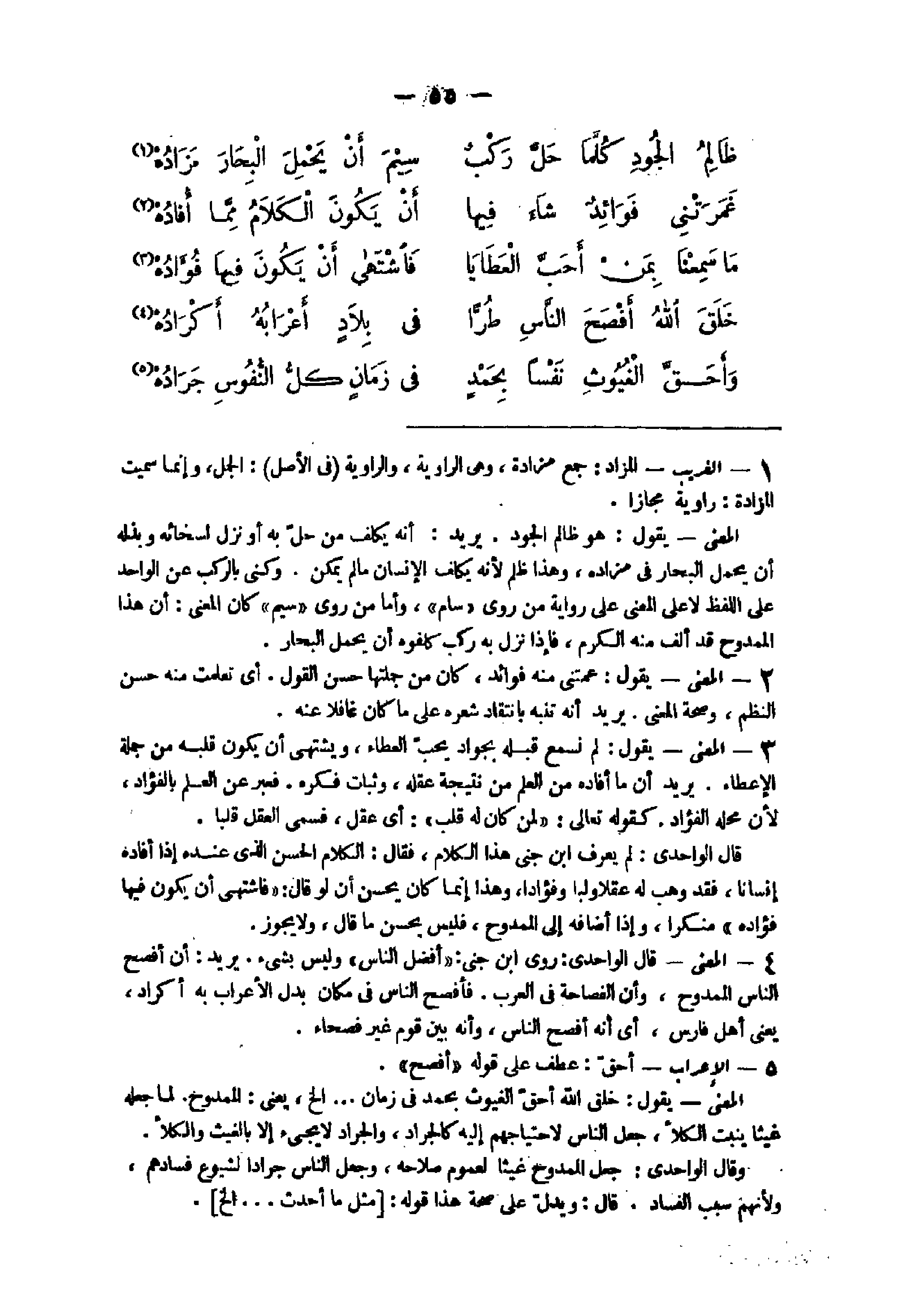 33 - الْإِعْرَاب أَحَق عطف على قَوْله أفْصح الْمَعْنى يَقُول خلق الله أَحَق الغيوث بِحَمْد فى زمَان ... الخ يعْنى الممدوح لما جعله غيثا ينْبت الْكلأ جعل النَّاس لاحتياجهم إِلَيْهِ كالجراد وَالْجَرَاد لَا يحيا إِلَّا بالغيث والكلأ وَقَالَ الواحدى جعل الممدوح غيثا لعُمُوم صَلَاحه وَجعل النَّاس جَرَادًا لشيوع فسادهم وَلِأَنَّهُم سَبَب الْفساد قَالَ وَيدل على صِحَة هَذَا قَوْله