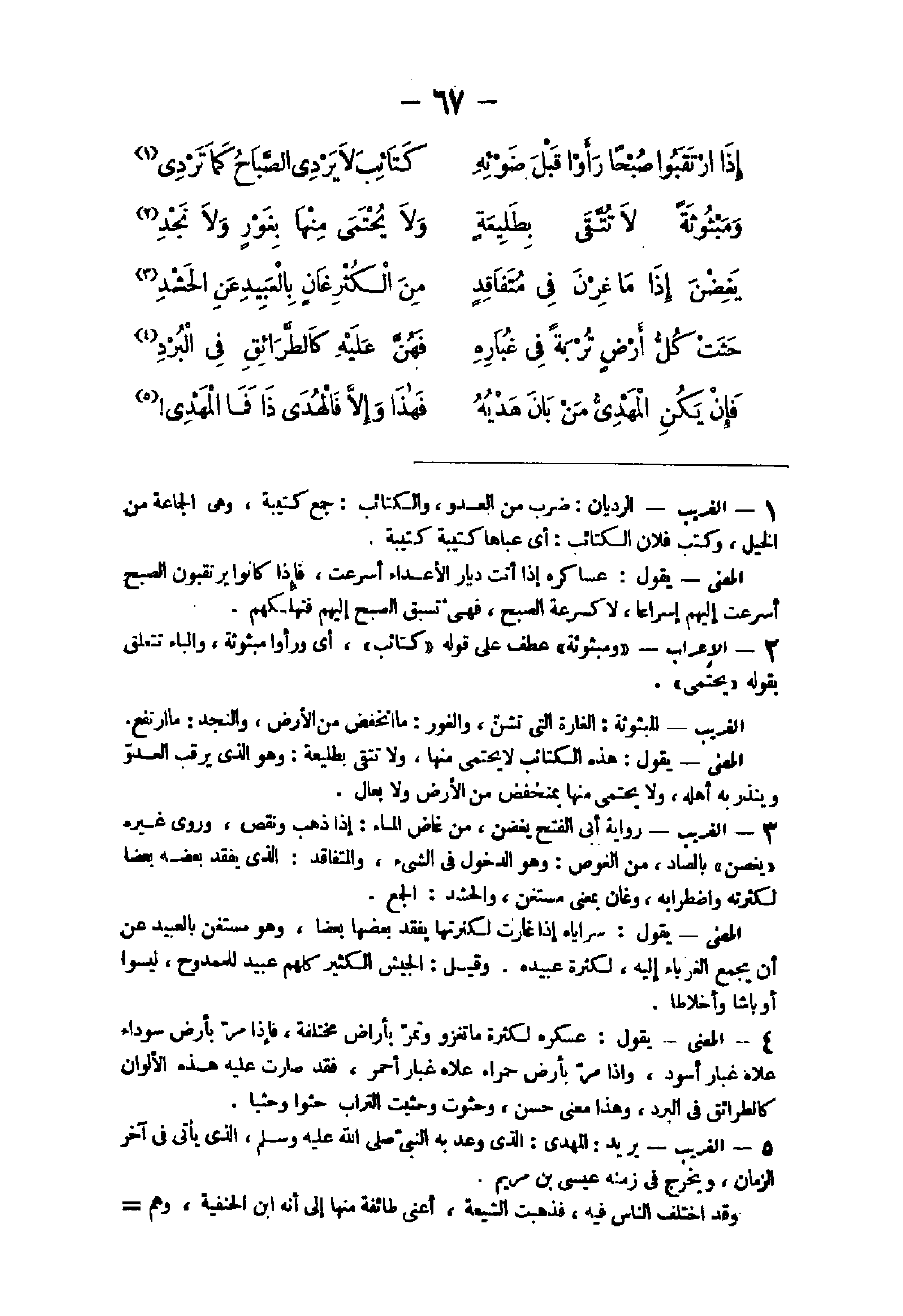 - الْغَرِيب الرديان ضرب من الْعَدو والكتائب جمع كَتِيبَة وهى الْجَمَاعَة من الْخَيل وَكتب فلَان الْكَتَائِب أى عبأها كَتِيبَة كَتِيبَة الْمَعْنى يَقُول عساكره إِذا أَتَت ديار الْأَعْدَاء أسرعت فَإِذا كَانُوا يرتقبون الصُّبْح أسرعت إِلَيْهِم إسراعا لَا كسرعة الصُّبْح فهى تسبق الصُّبْح إِلَيْهِم فتهلكهم