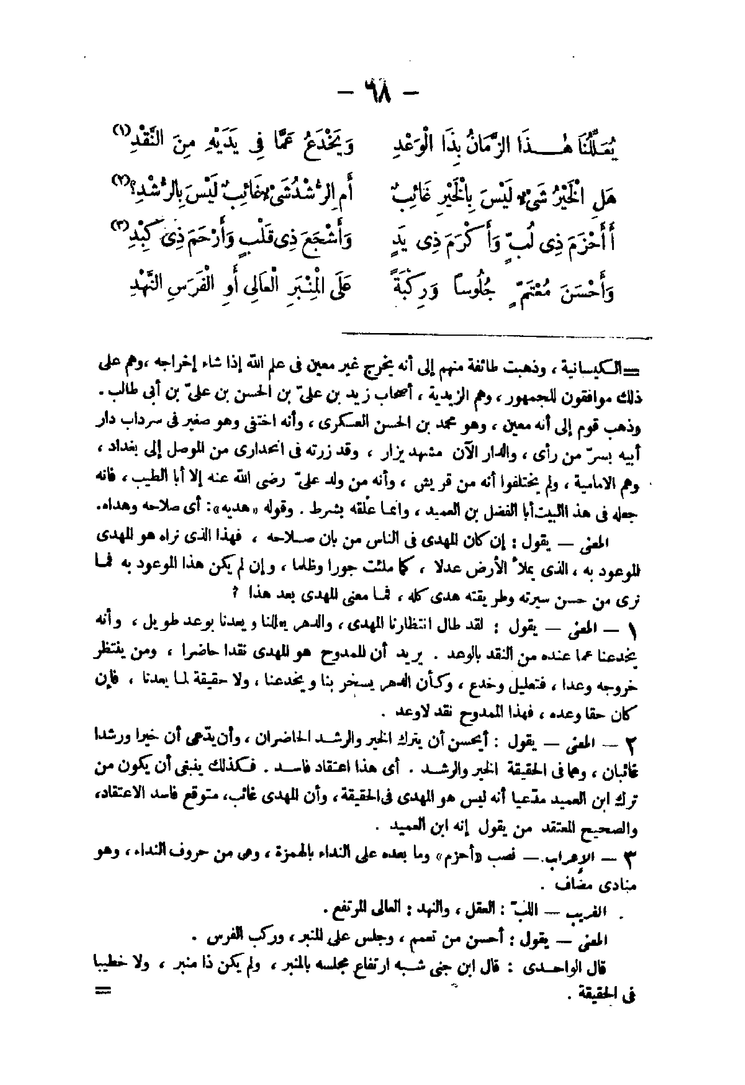 34 - الْمَعْنى يَقُول أيحسن أَن يتْرك الْخَيْر والرشد الحاضران وَأَن يدعى أَن خيرا ورشدا غائبان وهما فى الْحَقِيقَة الْخَيْر والرشد أى هَذَا اعْتِقَاد فَاسد فَكَذَلِك ينبغى أَن يكون من ترك ابْن العميد مُدعيًا أَنه لَيْسَ هُوَ المهدى فى الْحَقِيقَة وَأَن المهدى غَائِب متوقع فَاسد الِاعْتِقَاد وَالصَّحِيح المعتقد من يَقُول إِنَّه ابْن العميد