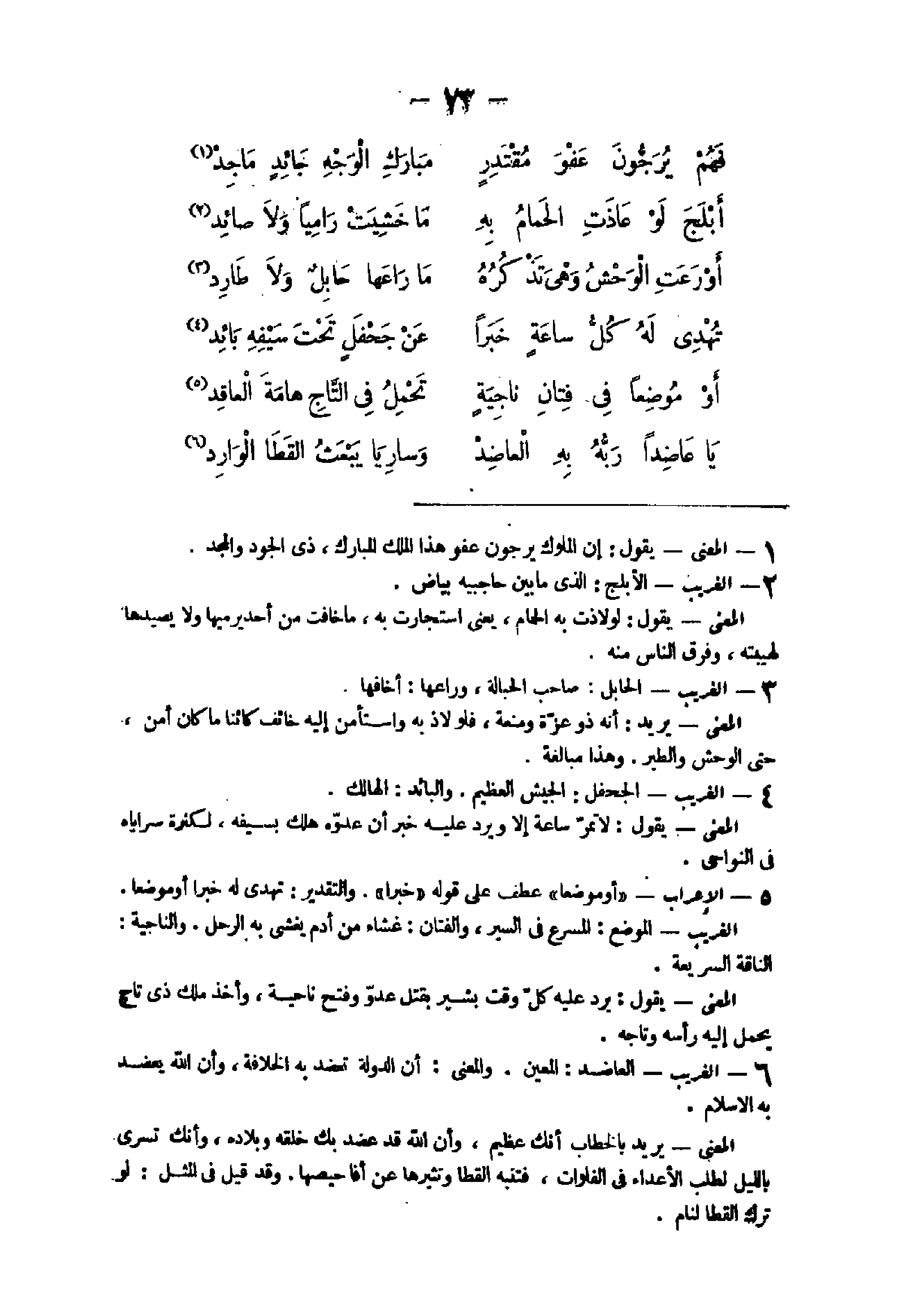 21 - الْغَرِيب العاضد الْمعِين وَالْمعْنَى أَن الدولة تعضد بِهِ الْخلَافَة وَأَن الله يعضد بِهِ الْإِسْلَام الْمَعْنى يُرِيد بِالْخِطَابِ أَنَّك عَظِيم وَأَن الله قد عضد بك خلقه وبلاده وَأَنَّك تسرى بِاللَّيْلِ لطلب الْأَعْدَاء فى الفلوات فَتنبه القطا وتثيرها عَن أفاحيصها وَقد قيل فى الْمثل لَو ترك القطا لنام