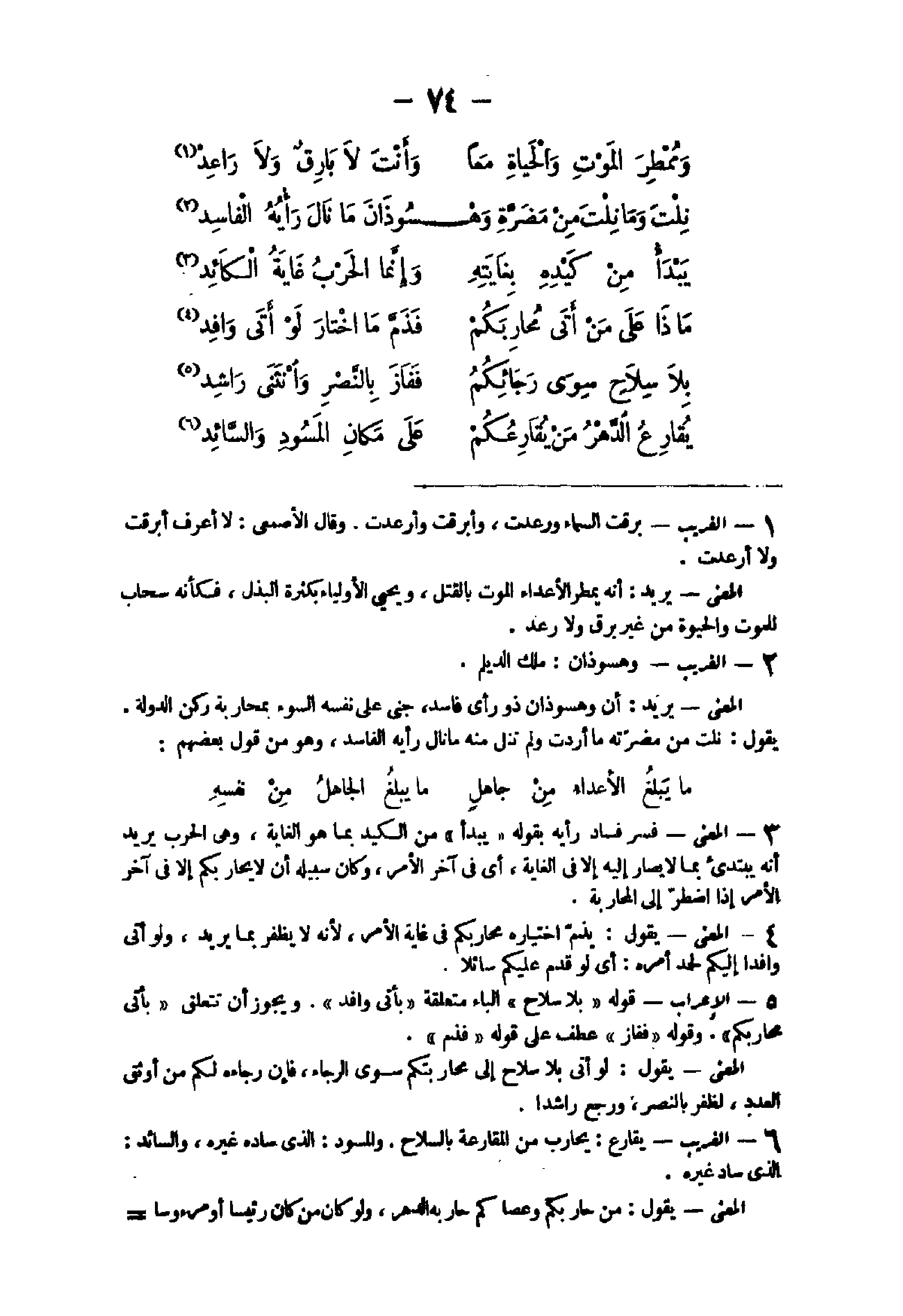 23 - الْغَرِيب وهسوذان ملك الديلم الْمَعْنى يُرِيد ان وهسوذان ذُو رأى فَاسد جنى على نَفسه السوء بمحاربة ركن الدولة يَقُول نلْت من مضرته مَا أردْت وَلم تنَلْ مِنْهُ مَا نَالَ رَأْيه الْفَاسِد وَهُوَ من قَول بَعضهم