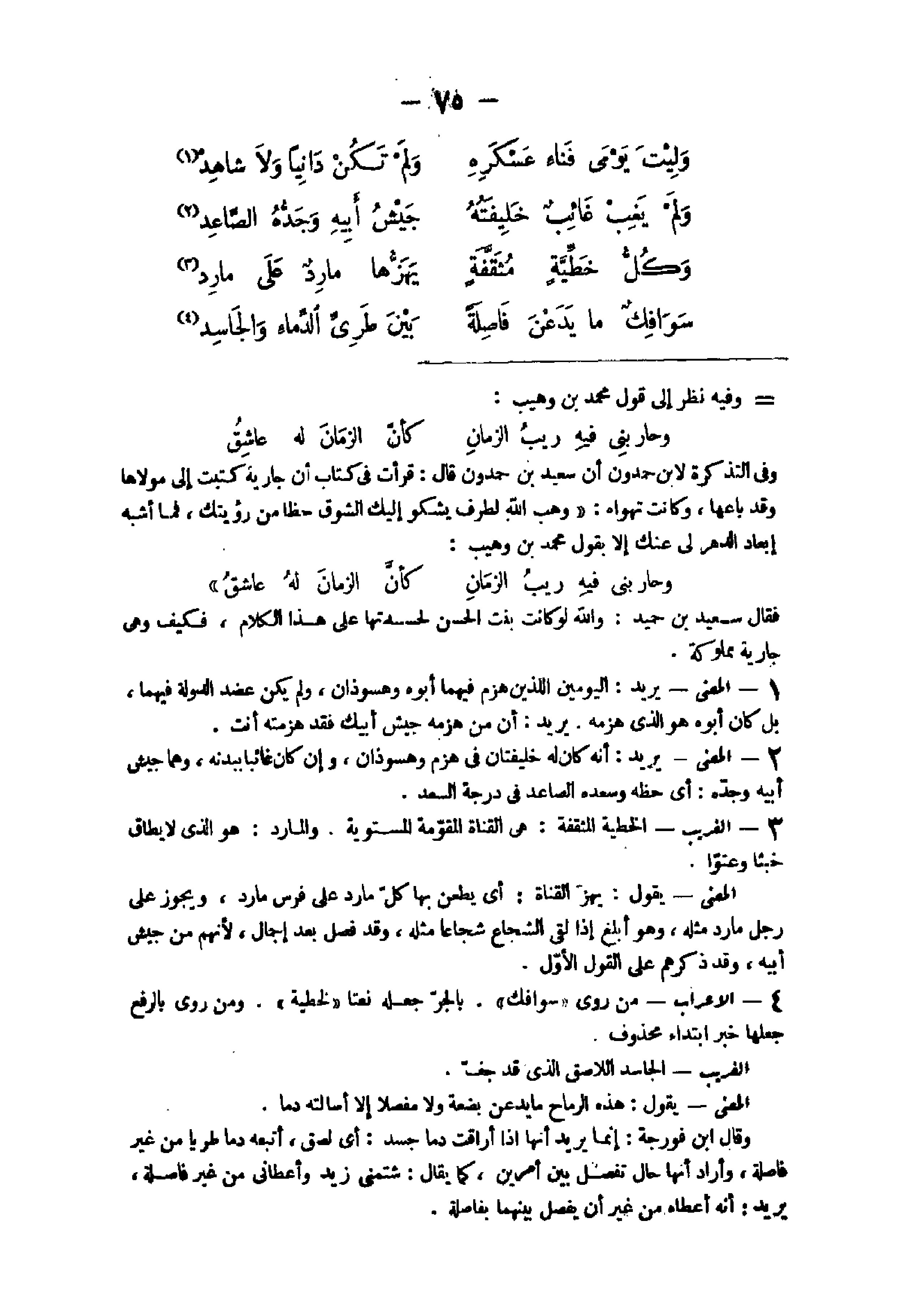31 - الْإِعْرَاب من روى سوافك بِالْجَرِّ جعله نعتا لخطية وَمن روى بِالرَّفْع جعلهَا خبر ابْتِدَاء مَحْذُوف الْغَرِيب الجاسد اللاصق الذى قد جف الْمَعْنى يَقُول هَذِه الرماح مَا يدعن بضعَة وَلَا مفصلا إِلَّا أسالته دَمًا وَقَالَ ابْن فورجة إِنَّمَا يُرِيد أَنَّهَا إِذا أراقت دَمًا جَسَد أى لصق أتبعه دَمًا طريا من غير فاصلة وَأَرَادَ أَنَّهَا حَال تفصل بَين أَمريْن كَمَا يُقَال شتمنى زيد وأعطانى من غير فاصلة يُرِيد أَنه أعطَاهُ من غير أَن يفصل بَينهمَا بفاصلة