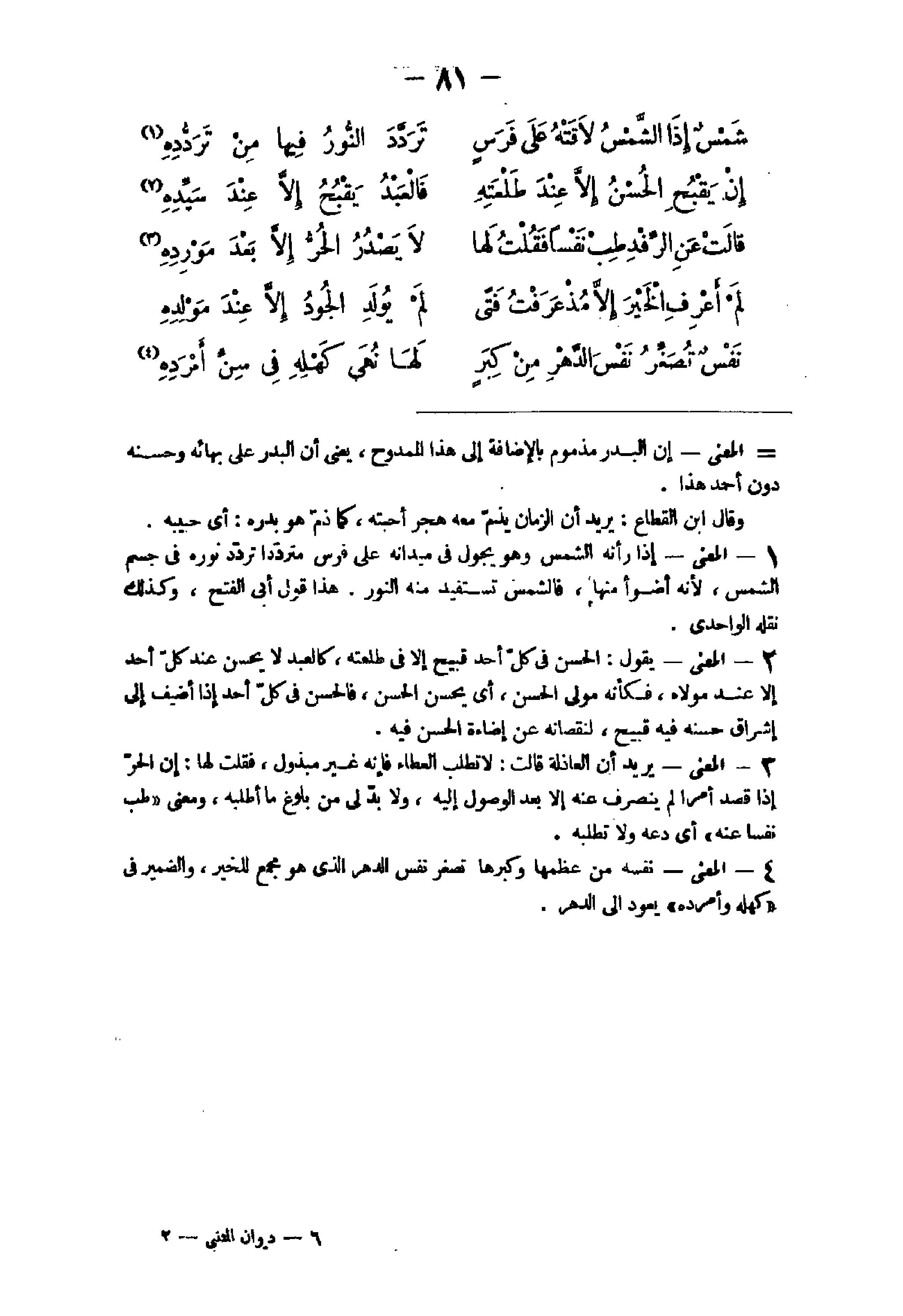 5 - الْمَعْنى يَقُول الْحسن فى كل أحد قَبِيح إِلَّا فى طلعته كَالْعَبْدِ لَا يحسن عِنْد كل أحد إِلَّا عِنْد مَوْلَاهُ فَكَأَنَّهُ مولى الْحسن أى يحسن الْحسن فالحسن فى كل أحد إِذا أضيف إِلَى إشراق حسنه فِيهِ قَبِيح لنقصانه عَن إضاءة الْحسن فِيهِ