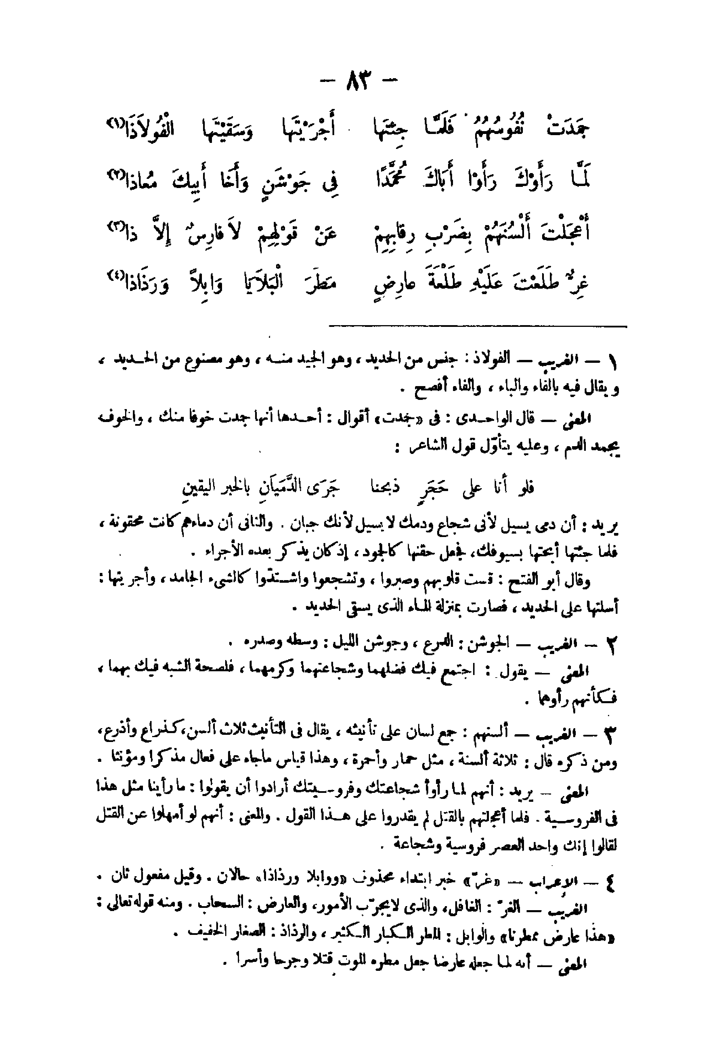 - الْغَرِيب الفولاذ جنس من الْحَدِيد وَهُوَ الْجيد مِنْهُ وَهُوَ مَصْنُوع من الْحَدِيد وَيُقَال فِيهِ بِالْفَاءِ وَالْبَاء وَالْفَاء أفْصح الْمَعْنى قَالَ الواحدى فى جمدت أَقْوَال أَحدهَا أَنَّهَا جمدت خوفًا مِنْك وَالْخَوْف يجمد الدَّم وَعَلِيهِ يتَأَوَّل قَول الشَّاعِر