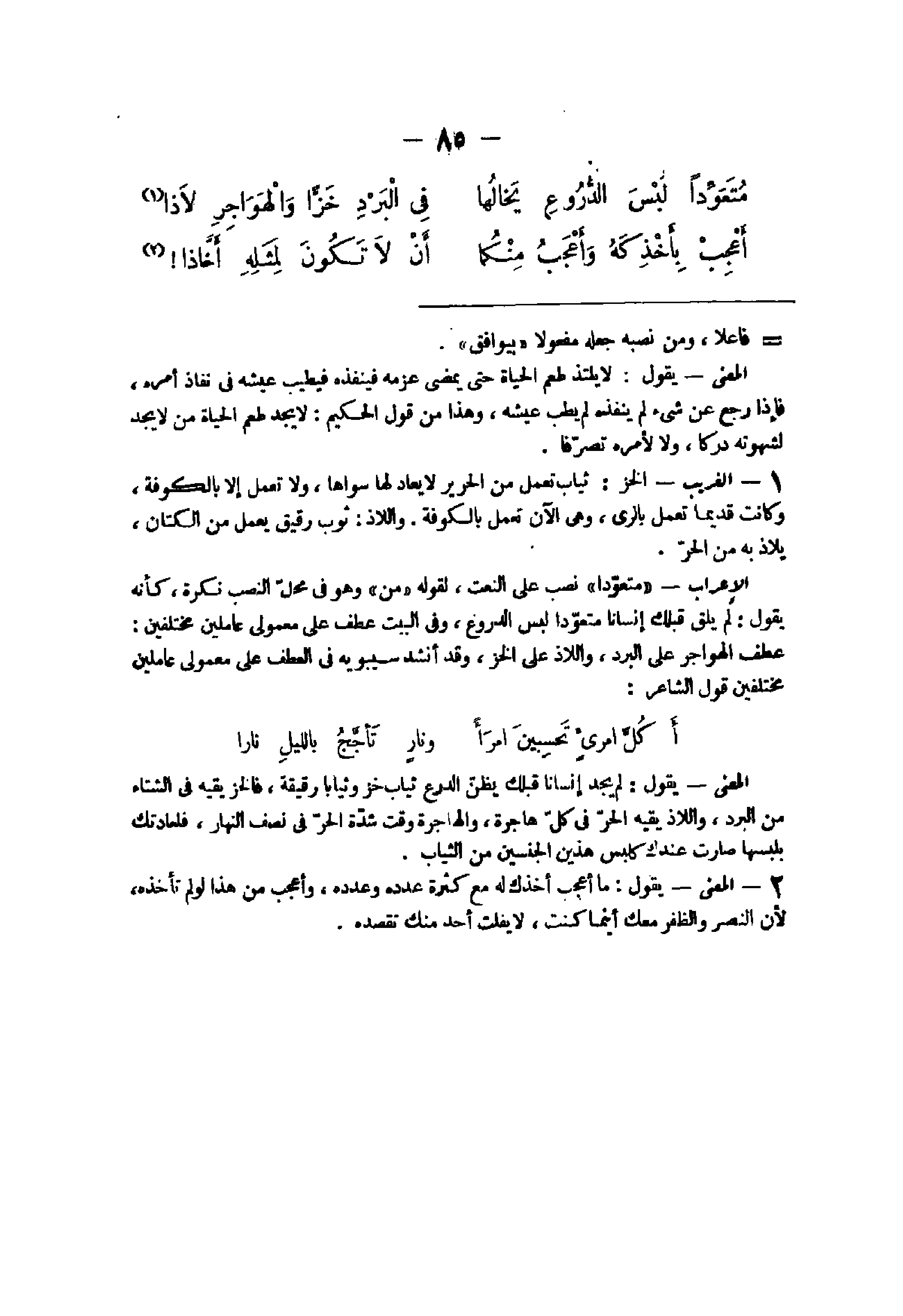 - الْغَرِيب الْخَزّ ثِيَاب تعْمل من الْحَرِير لَا يعادلها سواهَا وَلَا تعْمل إِلَّا بِالْكُوفَةِ وَكَانَت قَدِيما تعْمل بالرى وهى الْآن تعْمل بِالْكُوفَةِ واللاذ ثوب رَقِيق يعْمل من الْكتاب يلاذ بِهِ من الْحر الْإِعْرَاب متعودا نصب على النَّعْت لقَوْله من وَهُوَ فى مَحل النصب نكرَة كَأَنَّهُ يَقُول لم يلق قبلك إنْسَانا متعودا لبس الدروع وفى الْبَيْت عطف على معمولى عاملين مُخْتَلفين عطف الهواجر على الْبرد واللاذ على الْخَزّ وَقد أنْشد سِيبَوَيْهٍ فى الْعَطف على معمولى عاملين مُخْتَلفين قَول الشَّاعِر