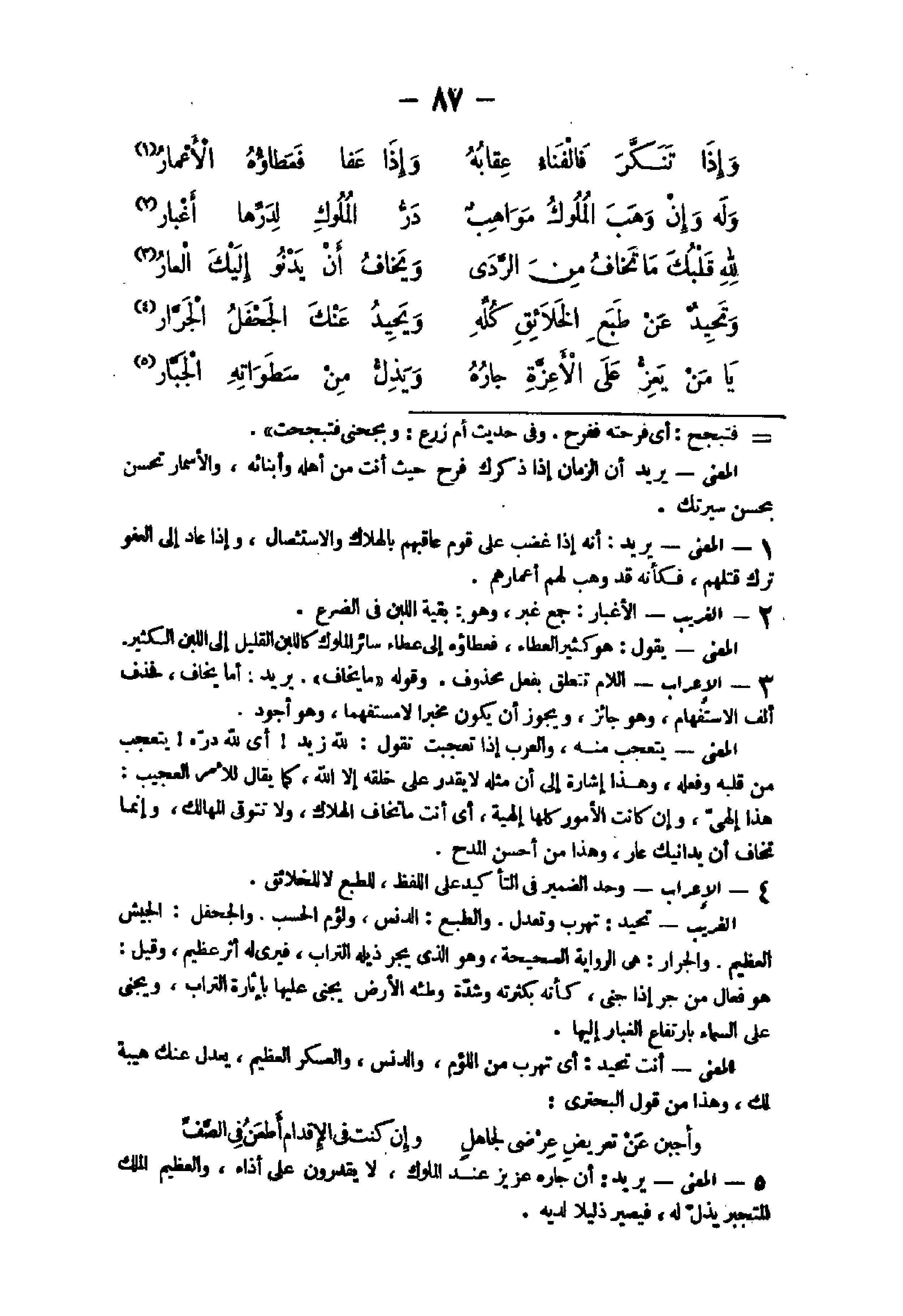 9 - الْإِعْرَاب اللَّام تتَعَلَّق بِفعل مَحْذُوف وَقَوله مَا يخَاف يُرِيد أما يخَاف تحذف ألف الِاسْتِفْهَام وَهُوَ جَائِز وَيجوز أَن يكون مخبرا لَا مستفهما وَهُوَ أَجود الْمَعْنى يتعجب مِنْهُ وَالْعرب إِذا تعجبت تَقول لله زيد أى لله دره يتعجب من قلبه وَفعله وَهَذَا إِشَارَة إِلَى أَن مثله لَا يقدر على خلقه إِلَّا الله كَمَا يُقَال لِلْأَمْرِ العجيب هَذَا إلهى وَإِن كَانَت الْأُمُور كلهَا إلهية أى أَنْت مَا تخَاف الْهَلَاك وَلَا تتوقى المهالك وَإِنَّمَا تخَاف أَن يدانيك عَار وَهَذَا من أحسن الْمَدْح