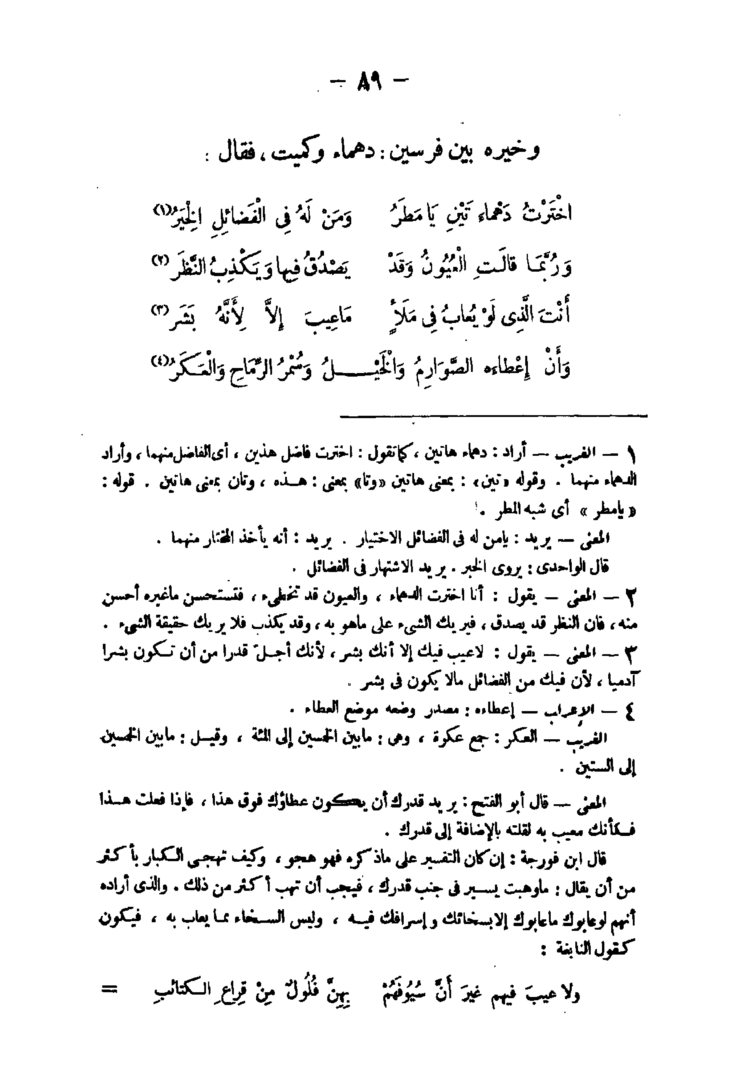 2 - الْمَعْنى يَقُول أَنا اخْتَرْت الدهماء والعيون قد تخطئ فتستحسن مَا غَيره أحسن مِنْهُ فَإِن النّظر قد يصدق فيريك الشئ على مَا هُوَ بِهِ وَقد يكذب فَلَا يُرِيك حَقِيقَة الشئ