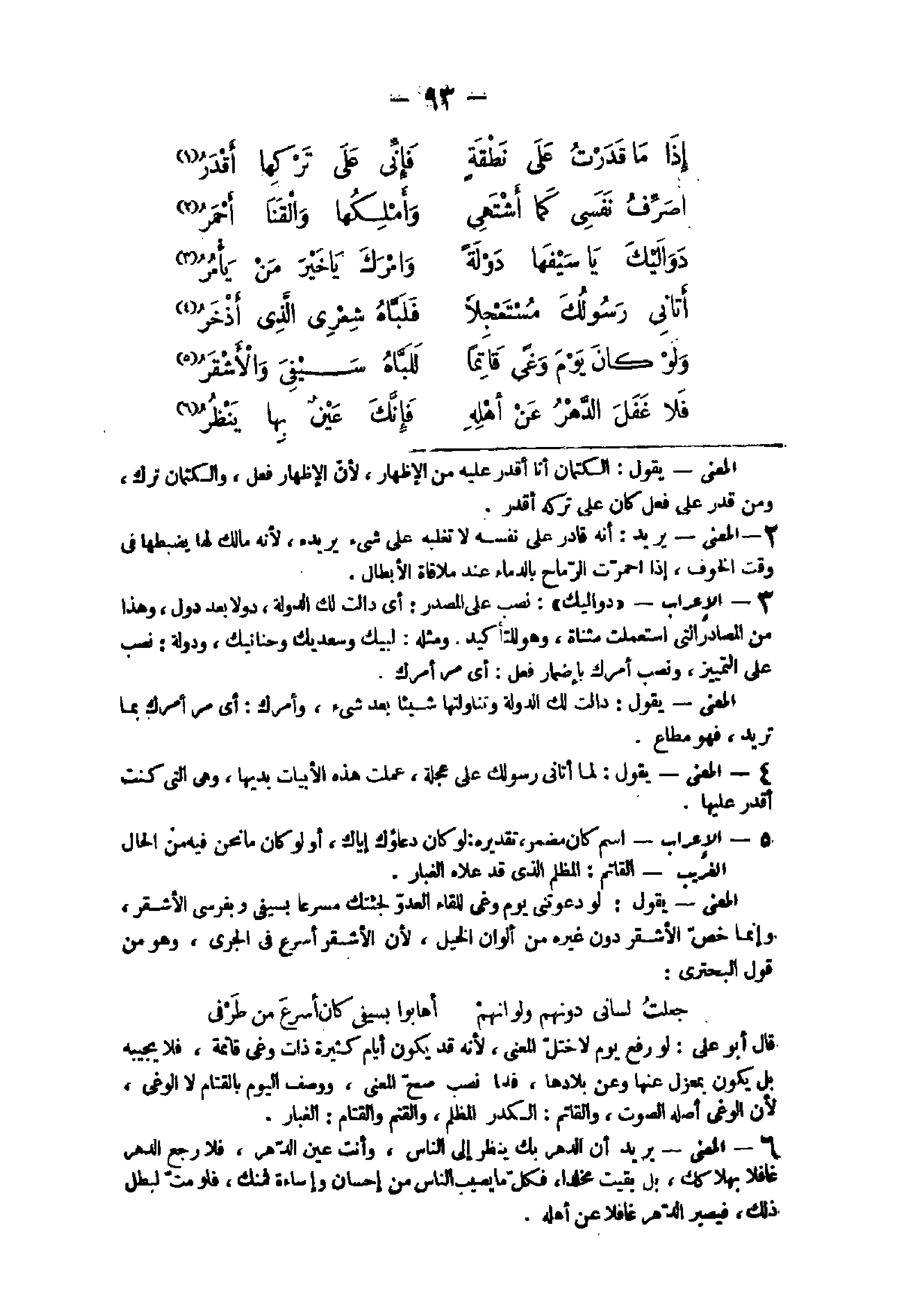 10 - الْإِعْرَاب اسْم كَانَ مُضْمر تَقْدِيره لَو كَانَ دعاؤك إياى أولو كَانَ مَا نَحن فِيهِ من الْحَال الْغَرِيب القاتم المظلم الذى قد علاهُ الْغُبَار الْمَعْنى يَقُول لَو دعوتنى يَوْم وغى للقاء الْعَدو لجئتك مسرعا بسيفى وبفرسى الْأَشْقَر وَإِنَّمَا خص الأشقردون غَيره من ألوان الْخَيل لِأَن الْأَشْقَر أسْرع فى الجرى وَهُوَ من قَول البحترى
