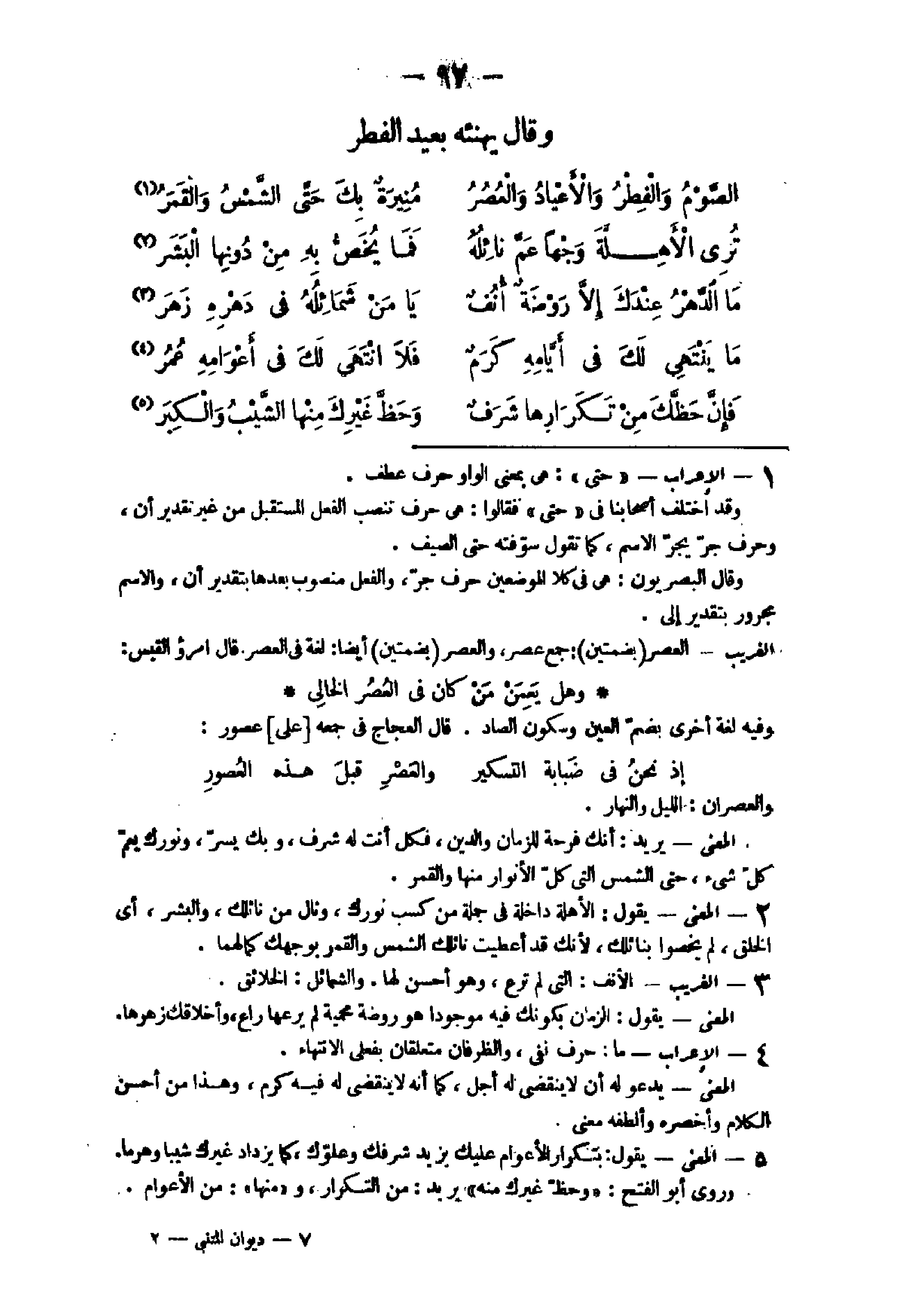 - 1 - الْإِعْرَاب حَتَّى هى بِمَعْنى الْوَاو حرف الْعَطف وَقد اخْتلف أَصْحَابنَا فى حَتَّى فَقَالُوا هى حرف تنصب الْفِعْل الْمُسْتَقْبل من غير تَقْدِير أَن وحرف جر يجر الِاسْم كَمَا تَقول سوفته حَتَّى الصَّيف وَقَالَ البصريون هى فى كلا الْمَوْضِعَيْنِ حرف جر وَالْفِعْل مَنْصُوب بعْدهَا بِتَقْدِير أَن وَالِاسْم مجرور بِتَقْدِير إِلَى الْغَرِيب الْعَصْر بِضَمَّتَيْنِ جمع عصر وَالْعصر بِضَمَّتَيْنِ أَيْضا لُغَة فى الْعَصْر قَالَ امْرُؤ الْقَيْس