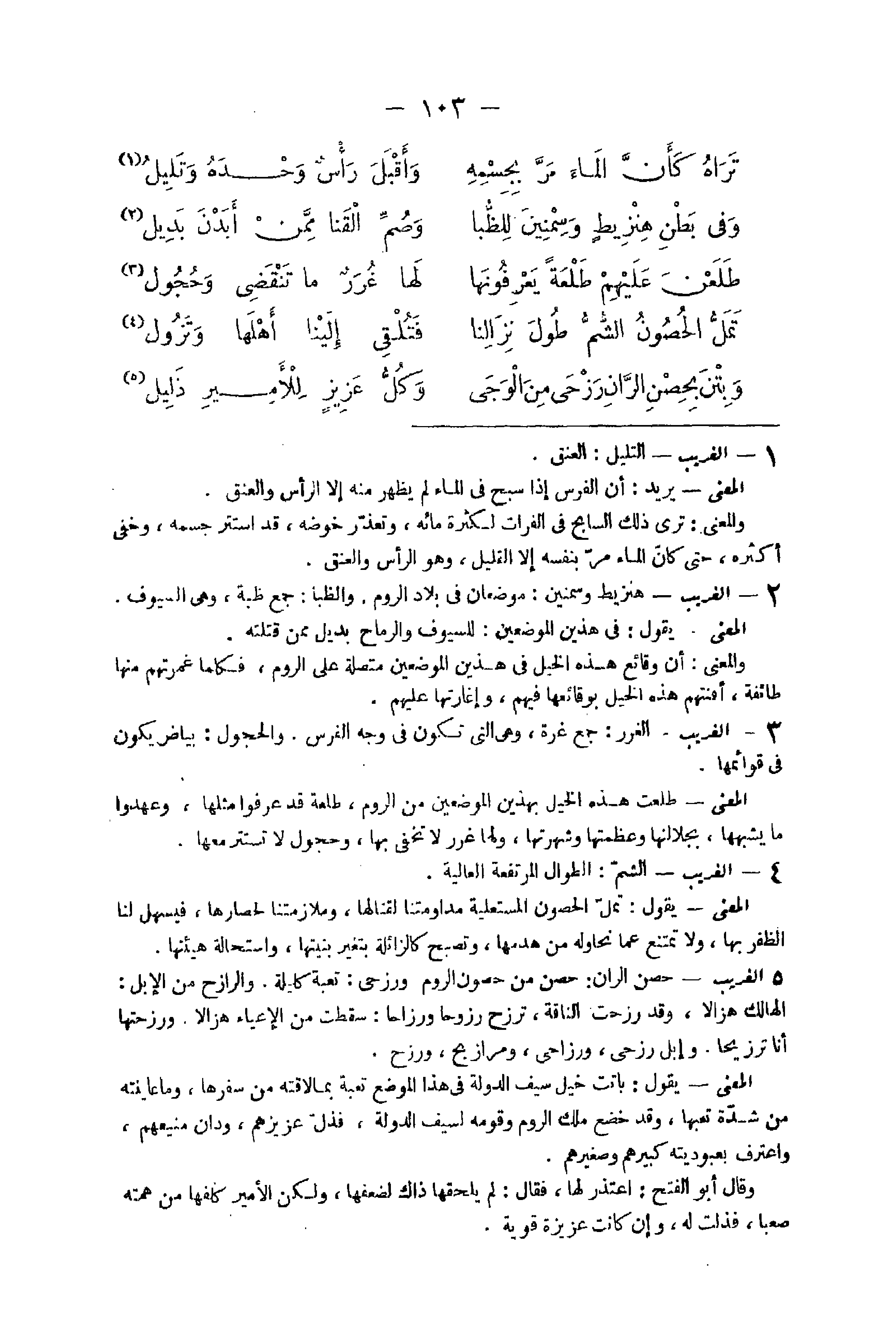 - الْغَرِيب التليل الْعُنُق الْمَعْنى يُرِيد أَن الْفرس إِذا سبح فِي المَاء لم يظْهر مِنْهُ إِلَّا الرَّأْس والعنق وَالْمعْنَى ترى ذَلِك السابح فِي الْفُرَات لِكَثْرَة مَائه وَتعذر خوضه قد استتر جِسْمه وخفى أَكْثَره حَتَّى كَأَن المَاء مر بِنَفسِهِ إِلَّا الْقَلِيل وَهُوَ الرَّأْس والعنق