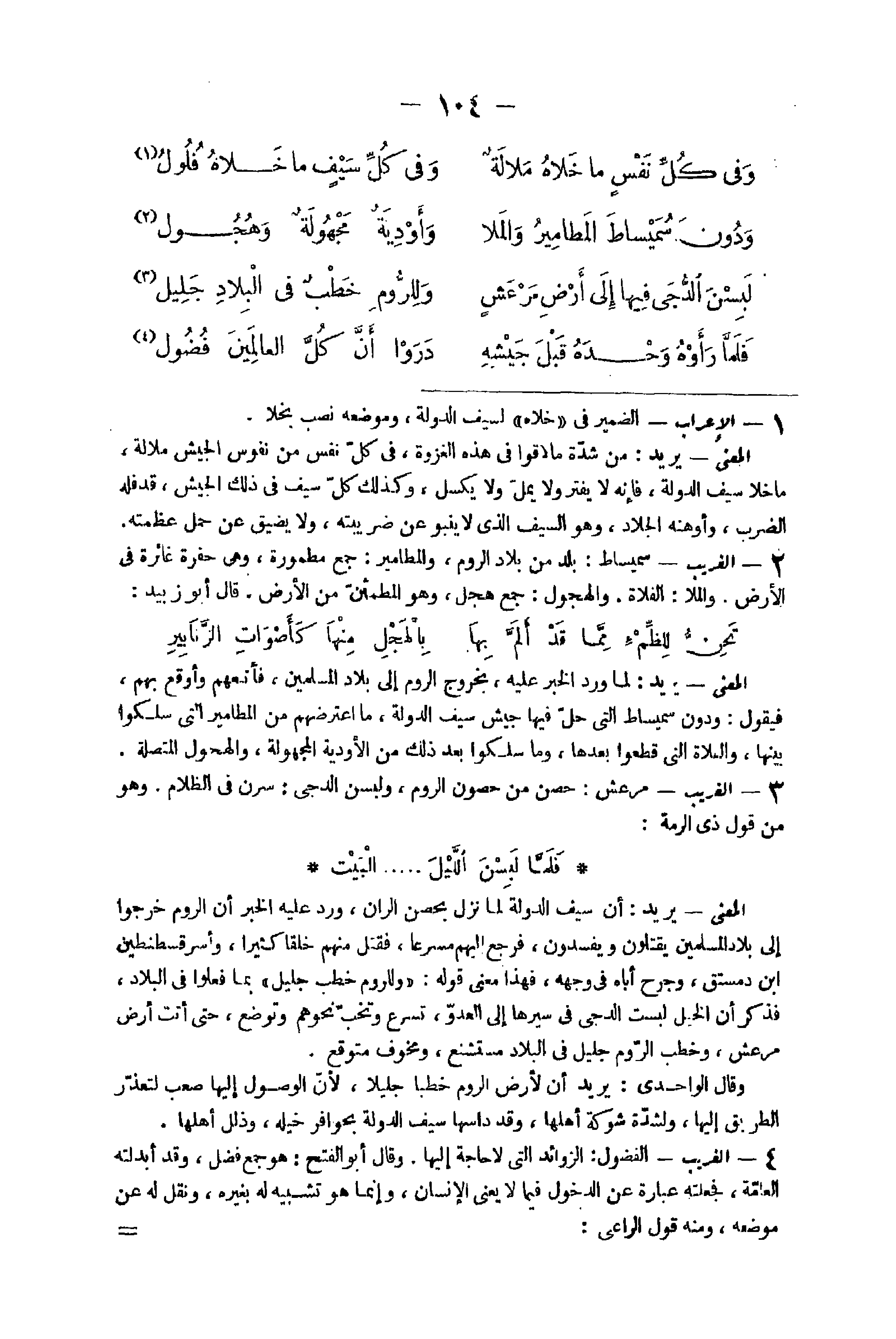 - الْإِعْرَاب الضَّمِير فِي خلاه لسيف الدولة وموضعه نصب بخلا الْمَعْنى يُرِيد من شدَّة مَا لاقوا فِي هَذِه الْغَزْوَة فِي كل نفس من نفوس الْجَيْش ملالة مَا خلا سيف الدولة فَإِنَّهُ لَا يفتر وَلَا يمل وَلَا يكسل وَكَذَلِكَ كل سيف فِي ذَلِك الْجَيْش قد فَلهُ الضَّرْب وأوهنه الجلاد وَهُوَ السَّيْف الَّذِي لَا ينبو عَن ضريبته وَلَا يضيق عَن جمل عَظمته
