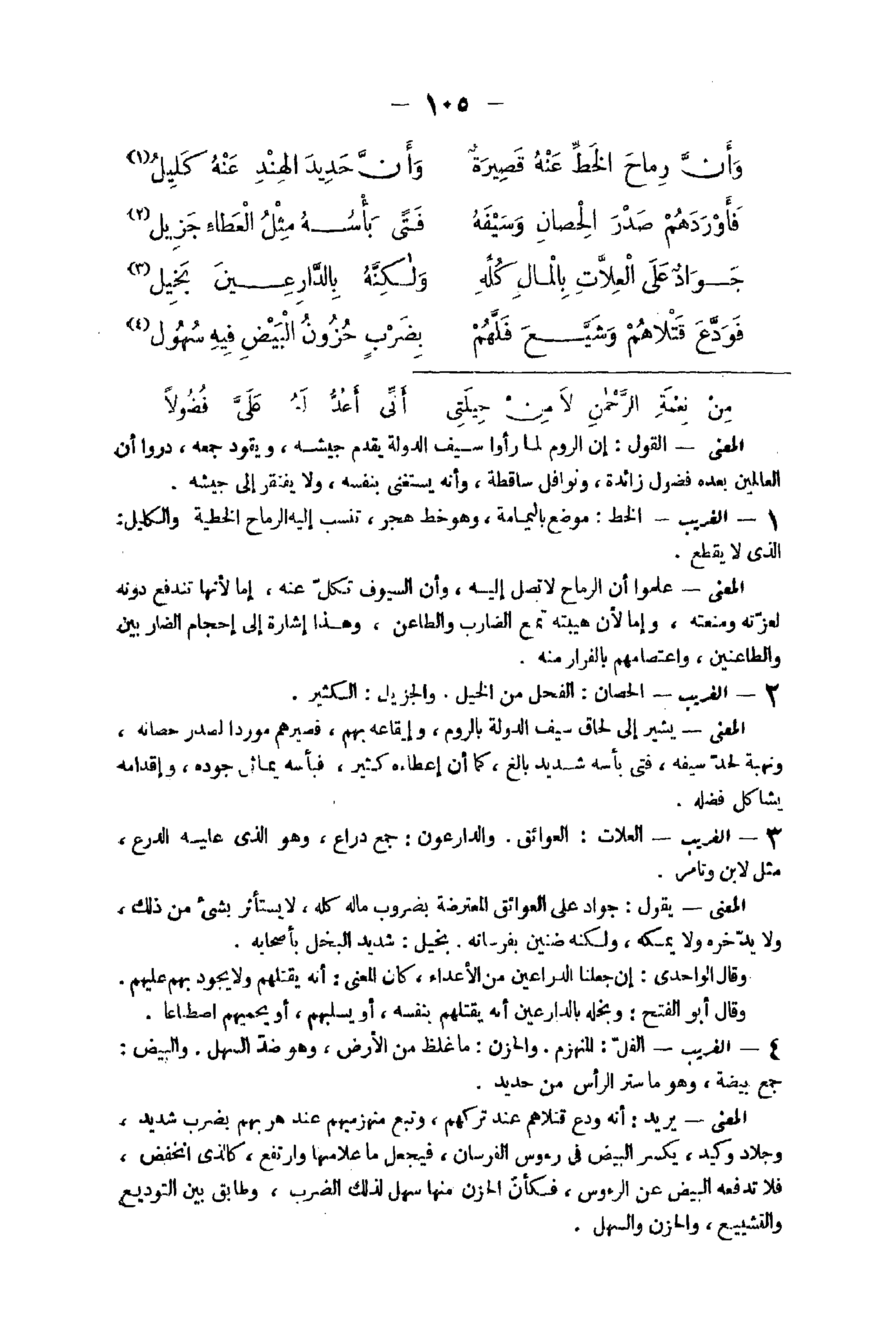 41 - الْغَرِيب الحصان الْفَحْل من الْخَيل والجزيل الْكثير الْمَعْنى يُشِير إِلَى لحاق سيف الدولة بالروم وإيقاعه بهم فصيرهم موردا لصدر حصانه ونهبه لحد سَيْفه فَتى بأسه شَدِيد بَالغ كَمَا أَن إعطاءه كثير فبأسه يماثل جوده وإقدامه يشاكل فَضله