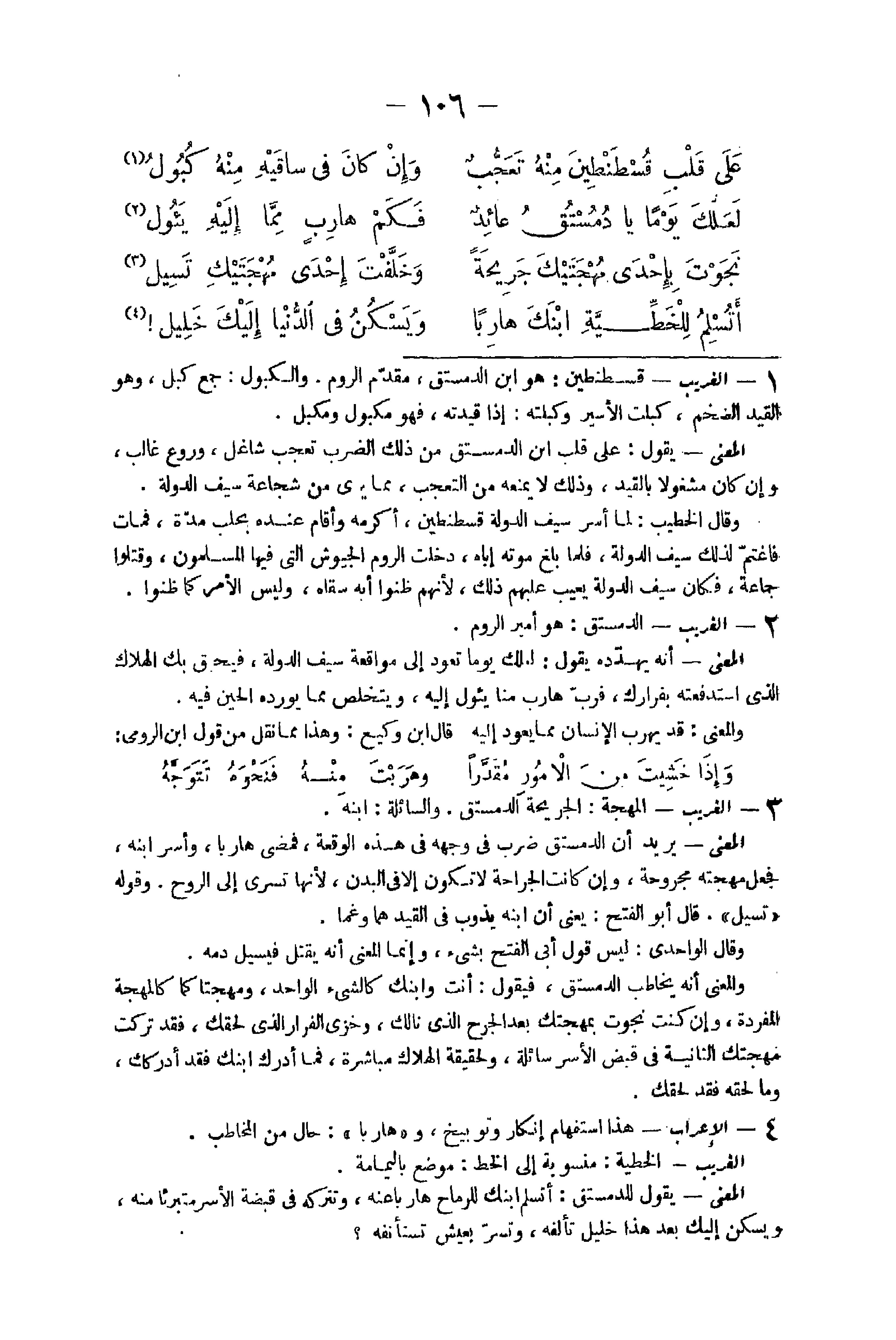 - الْغَرِيب قسطنطين هُوَ ابْن الدمستق مقدم الرّوم والكبول جمع كبل وَهُوَ الْقَيْد الضخم كبلت الْأَسير وكبلته إِذا قيدته فَهُوَ مكبول ومكبل الْمَعْنى يَقُول على قلب ابْن الدمستق من ذَلِك الضَّرْب تعجب شاغل وروع غَالب وَإِن كَانَ مَشْغُولًا بالقيد وَذَلِكَ لَا يمنعهُ من التَّعَجُّب مِمَّا يرى من شجاعة سيف الدولة وَقَالَ الْخَطِيب لما أسر سيف الدولة قسطنطين أكْرمه وَأقَام عِنْده بحلب مُدَّة فَمَاتَ فَاغْتَمَّ لذَلِك سيف الدولة فَلَمَّا بلغ مَوته أَبَاهُ دخلت الرّوم الجيوش الَّتِي فِيهَا الْمُسلمُونَ وَقتلُوا جمَاعَة فَكَانَ سيف الدولة يعيب عَلَيْهِم ذَلِك لأَنهم ظنُّوا أَنه سقَاهُ وَلَيْسَ الْأَمر كَمَا ظنُّوا