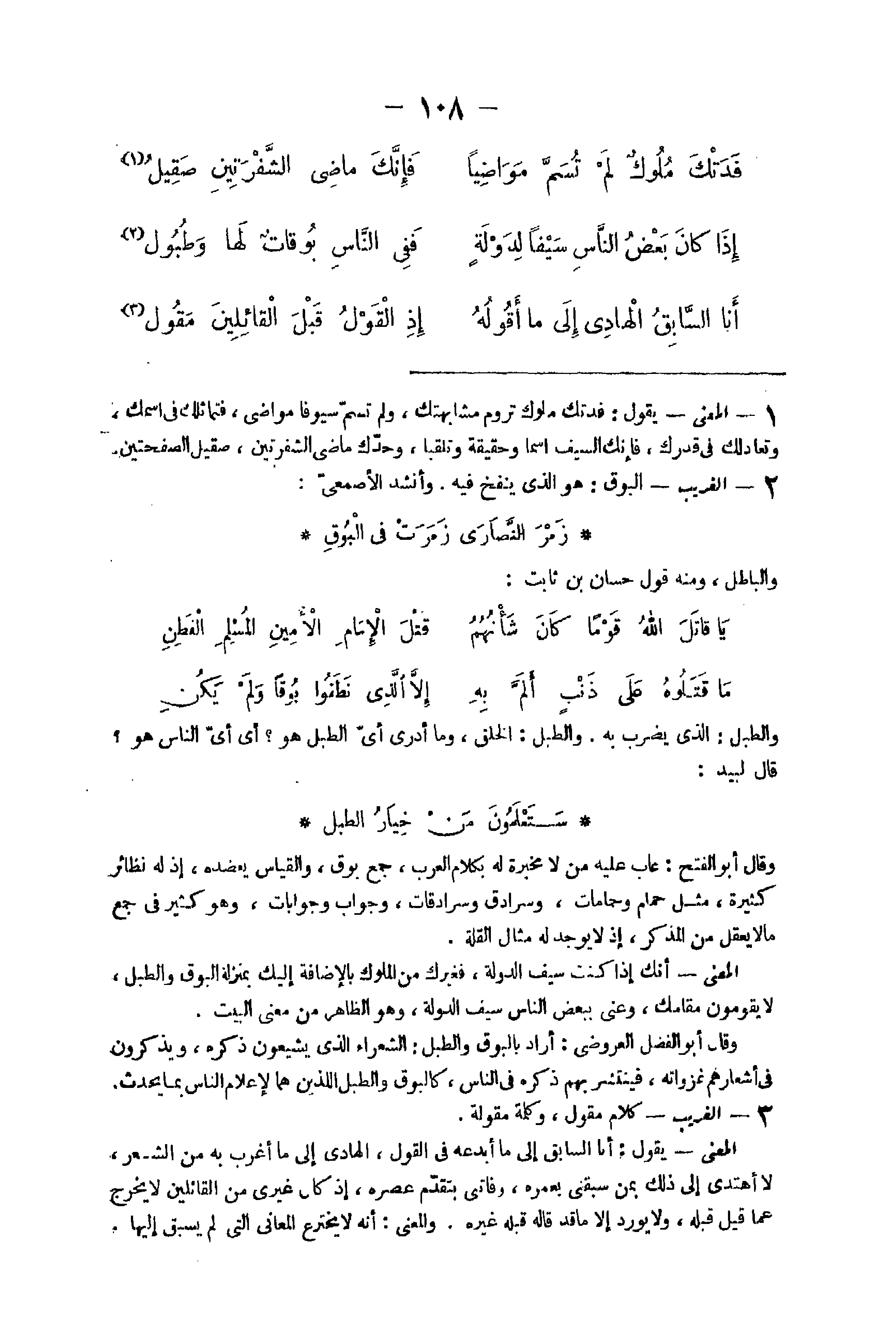 وَقَالَ أَبُو الْفَتْح عَابَ عَلَيْهِ من لَا مخبرة لَهُ بِكَلَام الْعَرَب جمع بوق وَالْقِيَاس يعضده إِذْ لَهُ نَظَائِر كَثِيرَة مثل حمام وحمامات وسرادق وسرادقات وَجَوَاب وجوابات وَهُوَ كثير فِي جمع مَالا يعقل من الْمُذكر إِذْ لَا يُوجد لَهُ مِثَال الْقلَّة الْمَعْنى انك إِذا كنت سيف الدولة فغيرك من الْمُلُوك بِالْإِضَافَة إِلَيْك بِمَنْزِلَة البوق والطبل لَا يقومُونَ مقامك وعني بِبَعْض النَّاس سيف الدولة وَهُوَ الظَّاهِر من معنى الْبَيْت وَقَالَ أَبُو الْفضل الْعَرُوضِي أَرَادَ بالبوق والطبل الشُّعَرَاء الَّذِي يَشْعُرُونَ ذكره ويذكرون فِي أشعارهم غَزَوَاته فينتشر بهم ذكره فِي النَّاس كالبوق والطبل اللَّذين هما لإعلام النَّاس بِمَا يحدث