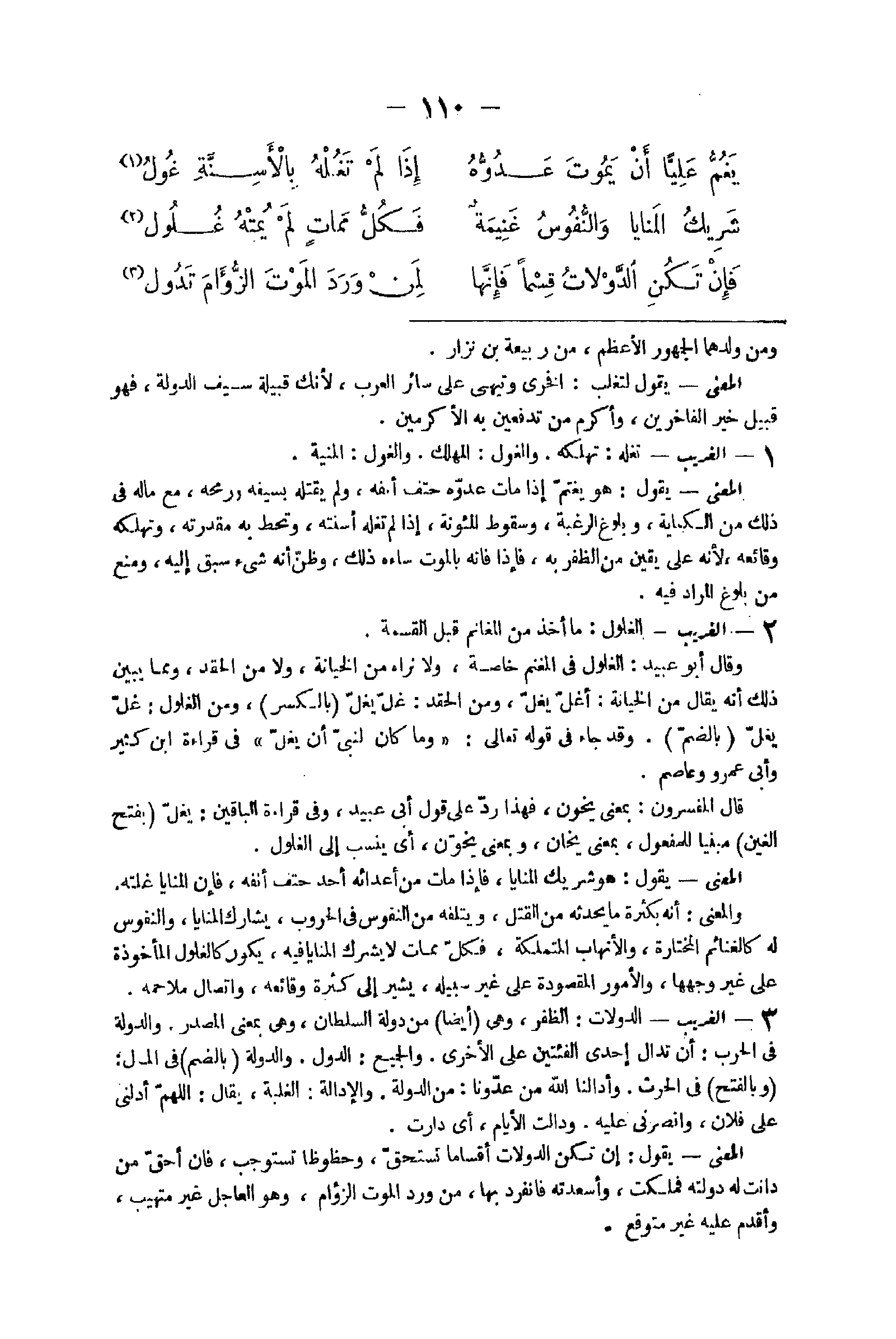 63 - الْغَرِيب تغله تهلكه والغول المهلك والغول الْمنية الْمَعْنى يَقُول هُوَ يغتم إِذا مَاتَ عدوه حتف أَنفه وَلم يقْتله بِسَيْفِهِ وَرمحه مَعَ مَاله فِي ذَلِك من الْكِفَايَة وبلوغ الرَّغْبَة وَسُقُوط المئونة إِذا لم تغله أسنته وتحط بِهِ مقدرته وتهلكه وقائعه لِأَنَّهُ على يَقِين من الظفر بِهِ فَإِذا فَاتَهُ بِالْمَوْتِ سَاءَهُ ذَلِك وَظن أَنه شَيْء سبق إِلَيْهِ وَمنع من بُلُوغ المُرَاد فِيهِ