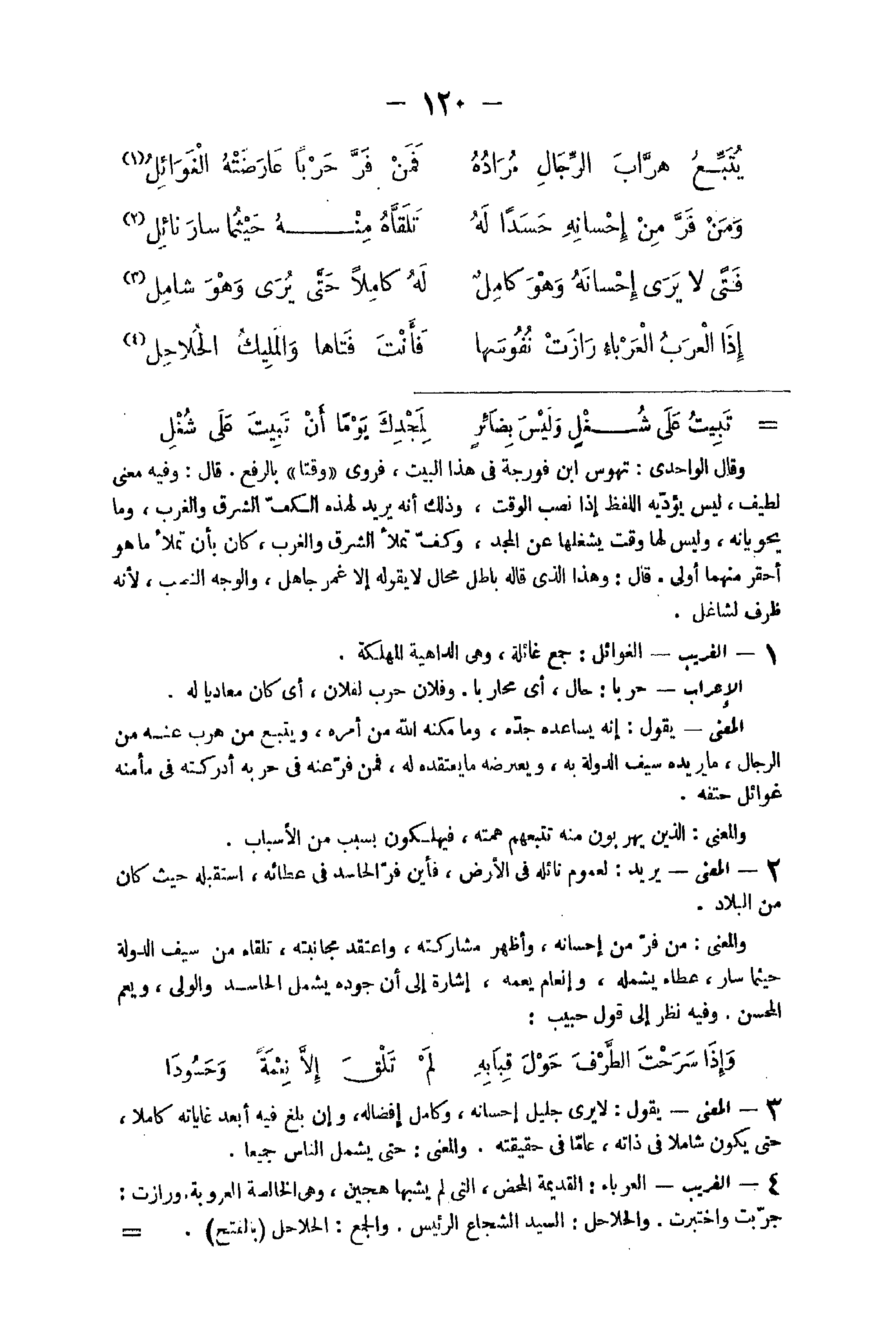 36 - الْغَرِيب الغوائل جمع غائلة وَهِي الداهية الْمهْلكَة الْإِعْرَاب حَربًا حَال أَي مُحَاربًا وَفُلَان حَرْب لفُلَان أَي كَانَ معاديا لَهُ الْمَعْنى يَقُول إِنَّه يساعده جده وَمَا مكنه الله من أمره وَيتبع من هرب عَنهُ من الرِّجَال مَا يُريدهُ سيف الدولة بِهِ ويعترضه مَا يَعْتَقِدهُ لَهُ فَمن فر عَنهُ فِي حريَّة أَدْرَكته فِي مأمنه غوائل حتفه وَالْمعْنَى الَّذين يهربون مِنْهُ تتبعهم همته فيهلكون بِسَبَب من الْأَسْبَاب