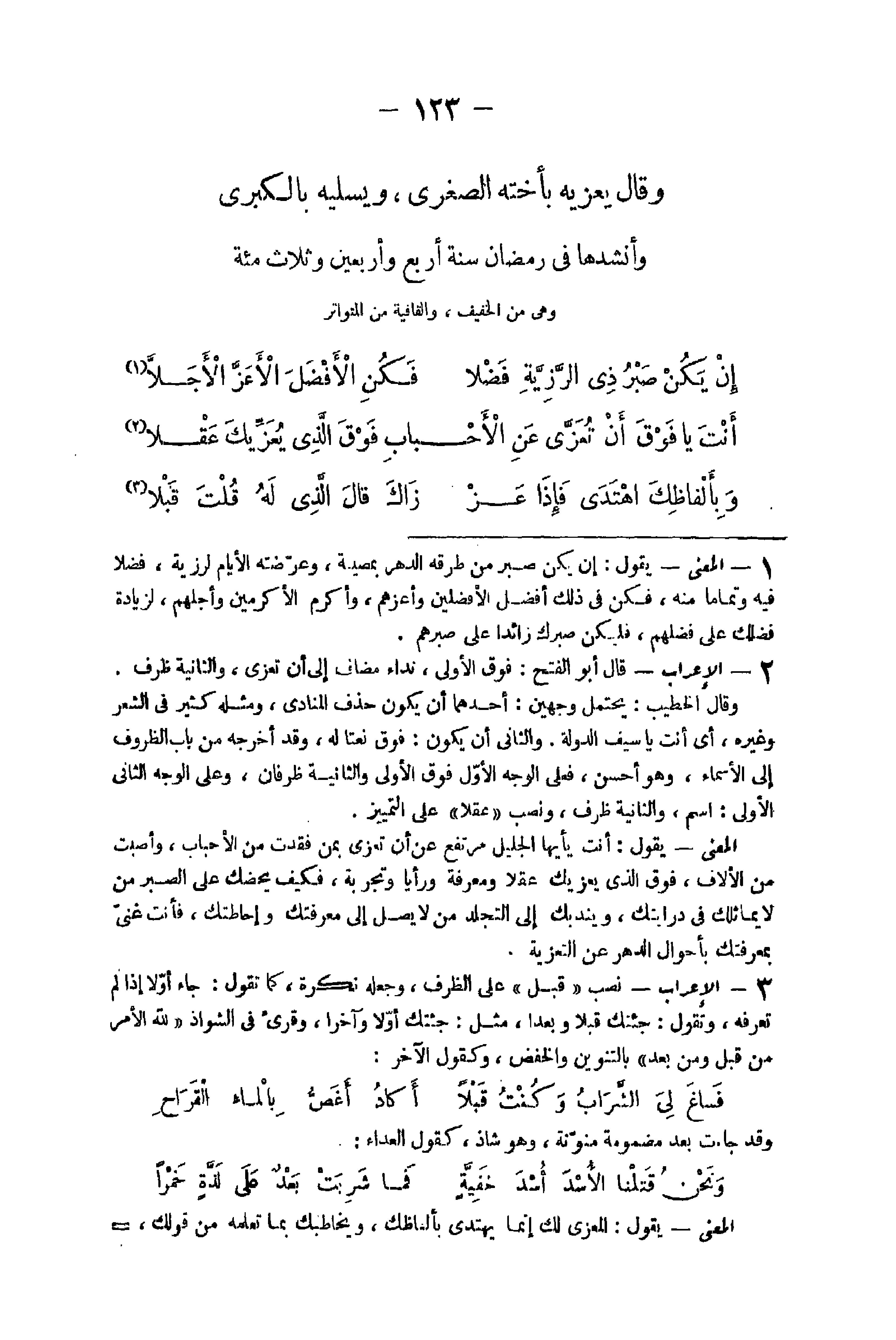- 1 الْمَعْنى يَقُول إِن يكن صَبر من طرقه الدَّهْر بمصيبة وعرضته الْأَيَّام لرزية فضلا فِيهِ وتماما مِنْهُ فَكُن فِي ذَلِك افضل الأفضلين وأعزهم وَأكْرم الأكرمين وأجلهم لزِيَادَة فضلك على فَضلهمْ فَلْيَكُن صبرك زَائِدا على صبرهم
