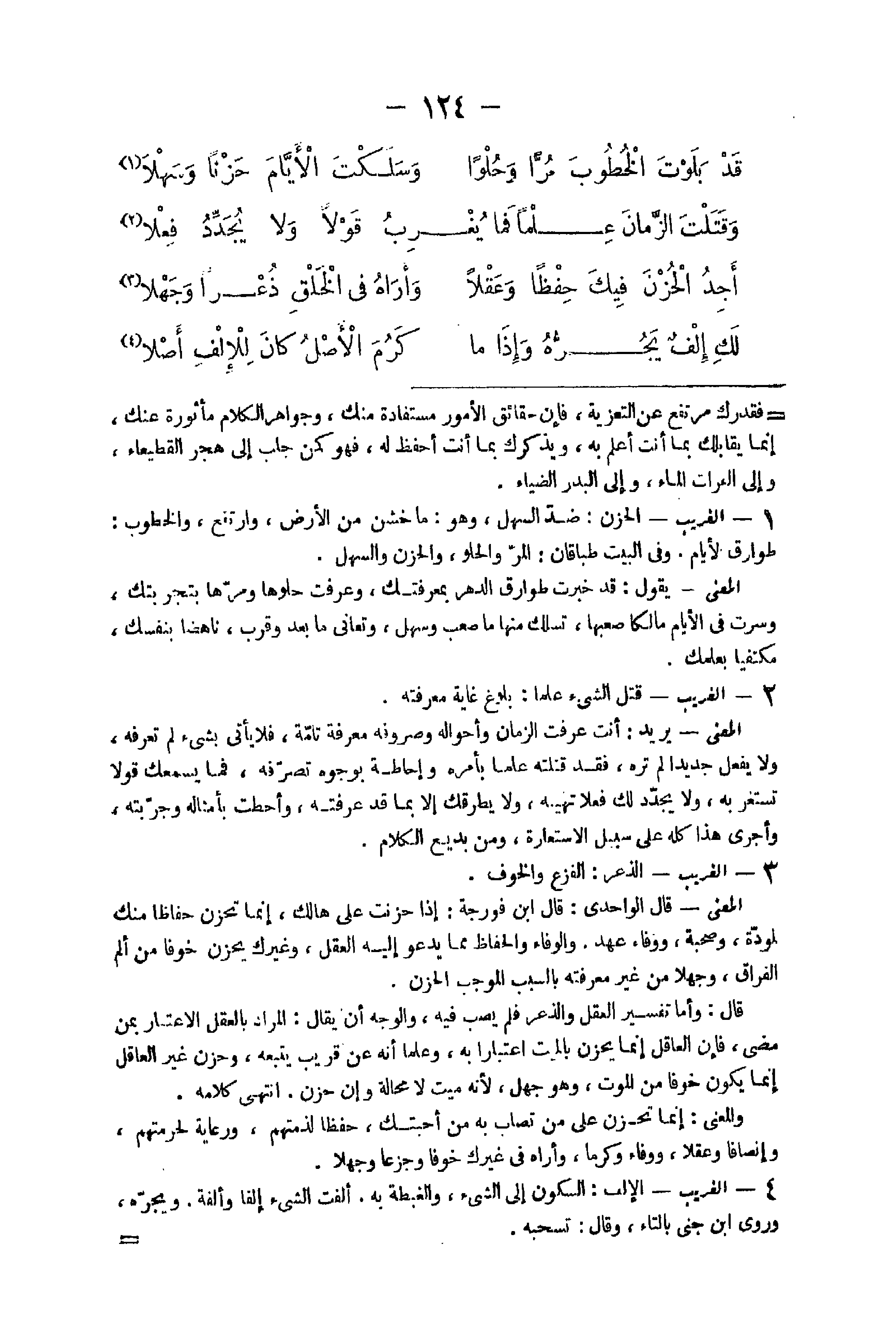 4 - الْغَرِيب الْحزن ضد السهل وَهُوَ مَا خشن من الأَرْض وارتفع والخطوب طوارق الْأَيَّام وَفِي الْبَيْت طباقان المر والحلو والحزن والسهل الْمَعْنى يَقُول قد خبرت طوارق الدَّهْر بمعرفتك وَعرفت حلوها ومرها بتجربتك وسرت فِي الْأَيَّام مَالِكًا صعبها تسلك مِنْهَا مَا صَعب وَسَهل وتعاني مَا بعد وَقرب ناهضا بِنَفْسِك مكتفيا بعلمك