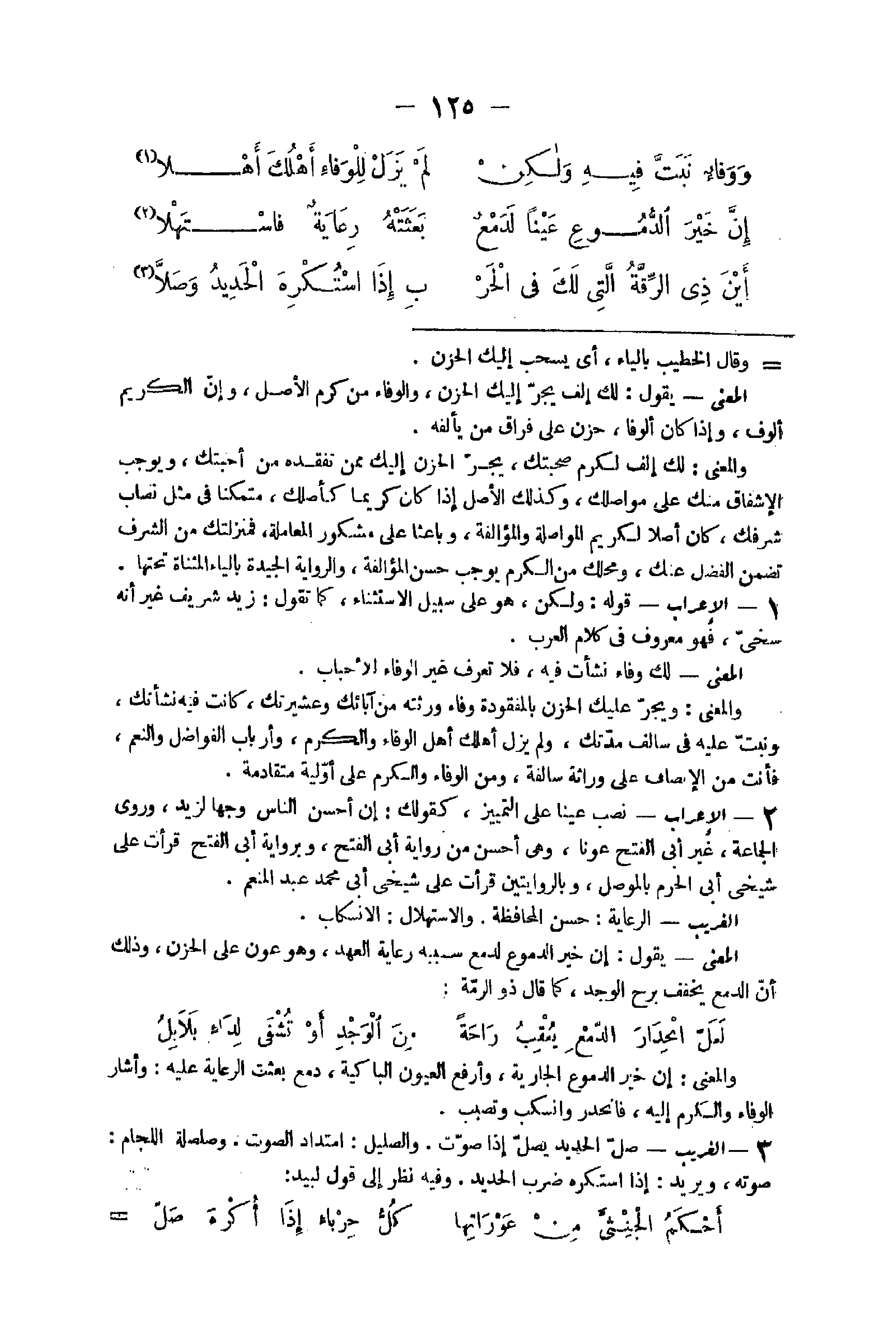 8 - الْإِعْرَاب قَوْله وَلَكِن هُوَ على سَبِيل الأستثناء كَمَا تَقول زيد شرِيف غير أَنه سخى فَهُوَ مَعْرُوف فِي كَلَام الْعَرَب الْمَعْنى لَك وَفَاء نشأت فِيهِ فَلَا تعرف غير الْوَفَاء للأحباب وَالْمعْنَى ويجر عَلَيْك الْحزن بالمفقودة وَفَاء ورثته من آبَائِك وعشيرتك كَانَت فِيهِ نشأتك وَنبت عَلَيْهِ فِي سالف مدتك وَلم يزل أهلك أهل الْوَفَاء وَالْكَرم وأرباب الفواضل وَالنعَم فَأَنت من الْإِنْصَاف على وراثة سالفة وَمن الْوَفَاء وَالْكَرم على أولية متقادمة