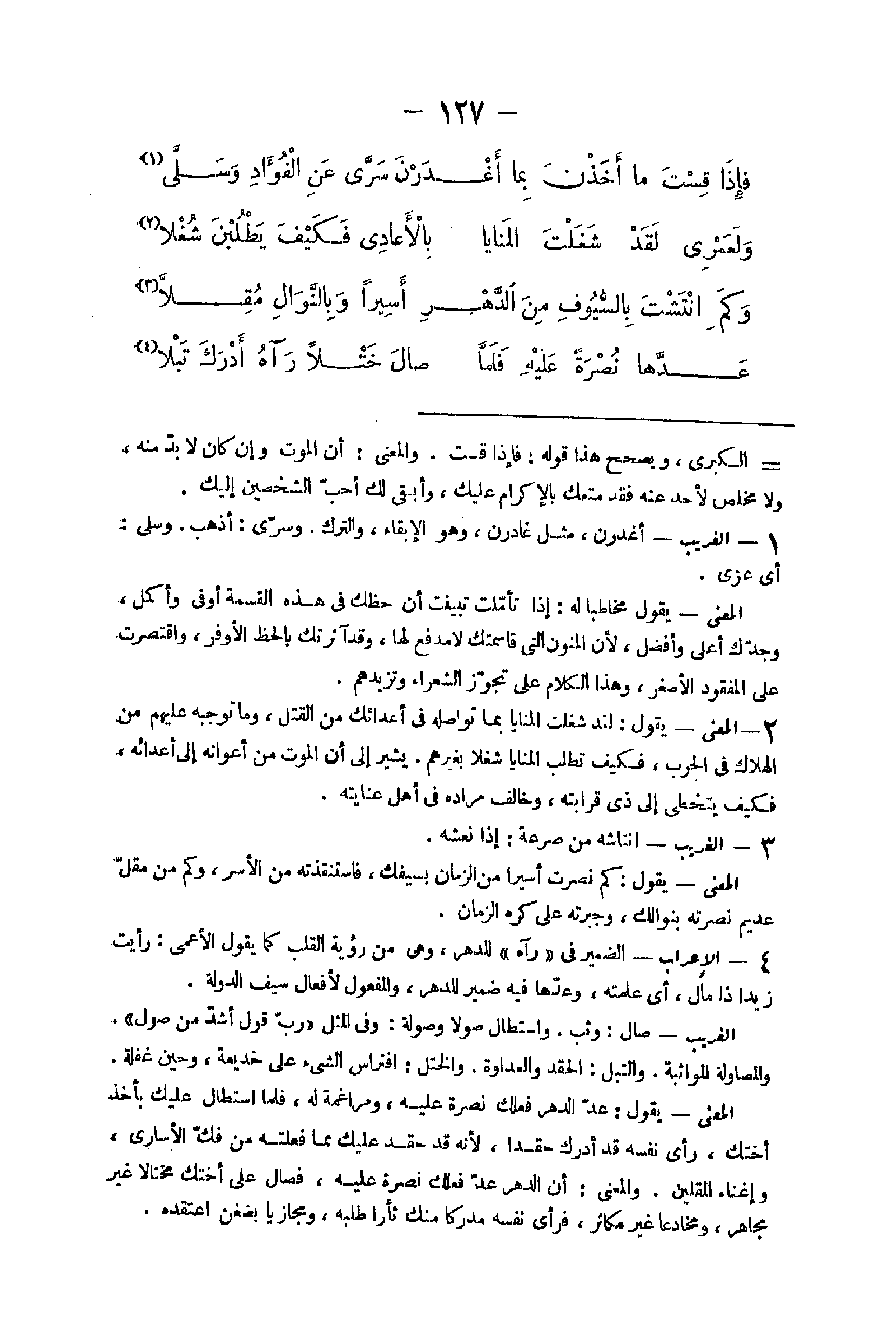 13 - الْغَرِيب أغدرن مثل غادرن وَهُوَ الْإِبْقَاء وَالتّرْك وسرى أذهب وسلى أَي عزى الْمَعْنى يَقُول مُخَاطبا لَهُ إِذا تَأَمَّلت تبينت أَن حظك فِي هَذِه الْقِسْمَة أَو فِي وأكمل وَجدك أَعلَى وَأفضل لِأَن الْمنون الَّتِي قاسمك لَا مدفع لَهَا وَقد آثرتك بالحظ الأوفر واقتصرت على الْمَفْقُود الْأَصْغَر وَهَذَا الْكَلَام على تجوز الشُّعَرَاء وتزيدهم