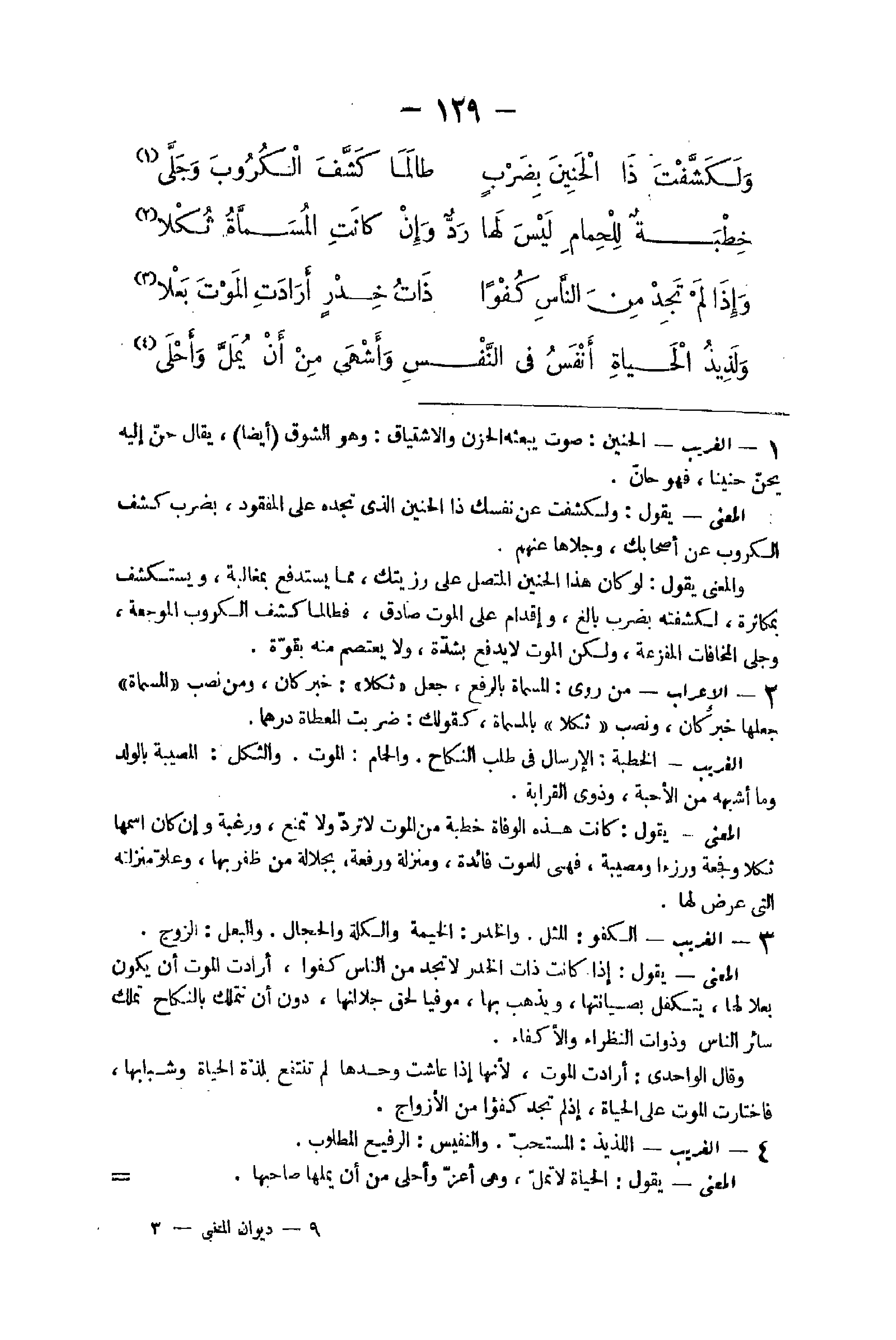 - الْغَرِيب الحنين صَوت يَبْعَثهُ الْحزن والاشتياق وَهُوَ الشوق أَيْضا يُقَال من إِلَيْهِ يحن حنينا فَهُوَ حَان الْمَعْنى يَقُول ولكشفت عَن نَفسك ذَا الحنين الَّذِي تَجدهُ على الْمَفْقُود بِضَرْب كشف الكروب عَن أَصْحَابك وجلاها عَنْهُم وَالْمعْنَى يَقُول لَو كَانَ هَذَا الحنين الْمُتَّصِل على رزيتك مِمَّا يستدفع بمغالبة ويستكشف بمكاثرة لكشفته بِضَرْب بَالغ وإقدام على الْمَوْت صَادِق فطالما كشف الكروب الموجعة وجلى المخافات المفزعة وَلَكِن الْمَوْت لَا يدْفع بِشدَّة وَلَا يعتصم مِنْهُ بِقُوَّة