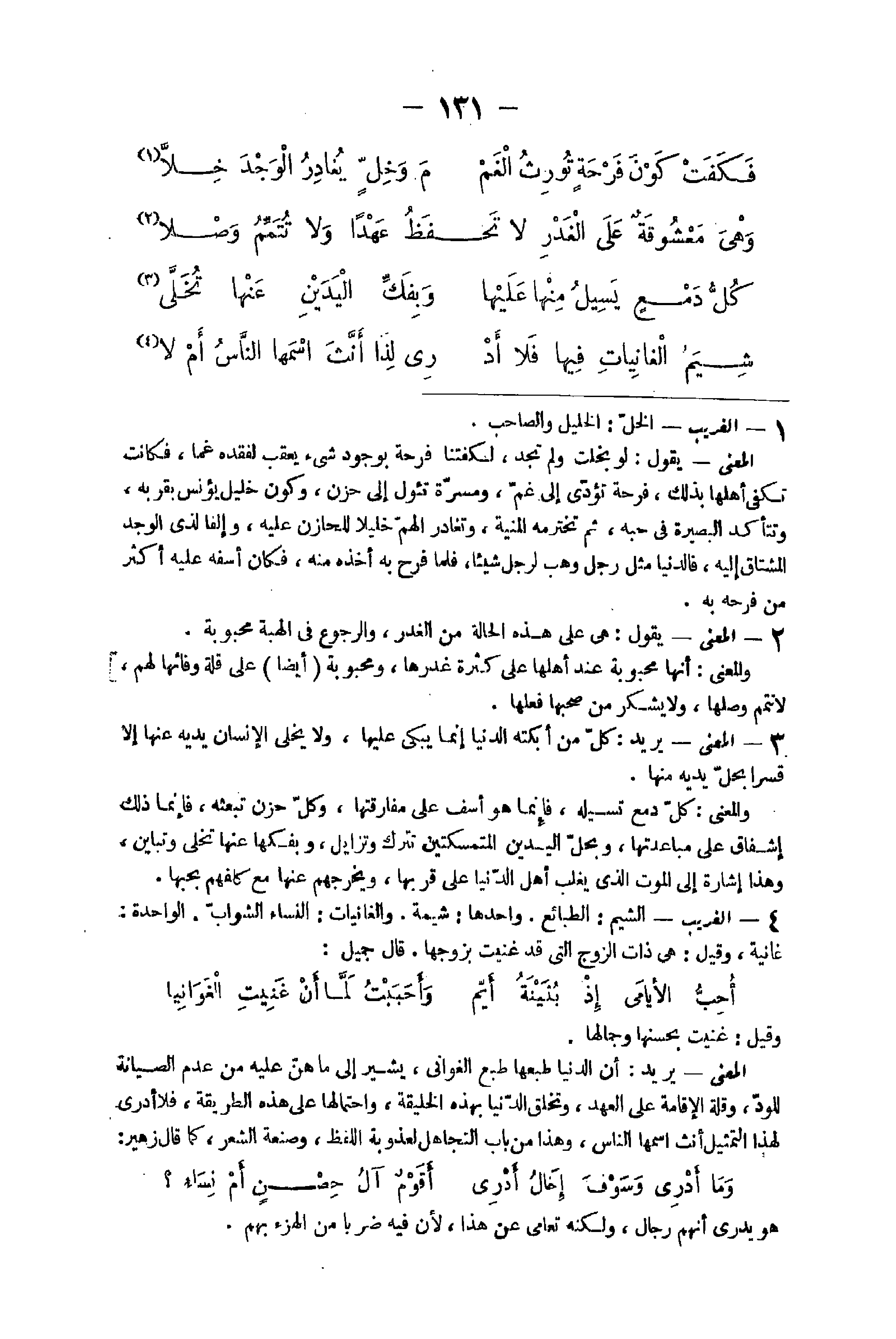 - الْغَرِيب الْخلّ الْخَلِيل والصاحب الْمَعْنى يَقُول لَو بخلت وَلم تَجِد لكفتنا فرحة بِوُجُود شَيْء يعقب لفقده عَمَّا فَكَانَت تكفى أَهلهَا بذلك فرحة تُؤدِّي إِلَى غم ومسرة تئول إِلَى حزن وَكَون خَلِيل يؤنس بِقُرْبِهِ وتتأكد البصيرة فِي حبه ثمَّ تخترمه الْمنية وتغادر الْهم خَلِيلًا للحازن عَلَيْهِ وإلفا لذِي الوجد المشتاق إِلَيْهِ فالدنيا مثل رجل وهب لرجل شَيْئا فَلَمَّا فَرح بِهِ أَخذه مِنْهُ فَكَانَ أسفه عَلَيْهِ أَكثر من فرحه بِهِ