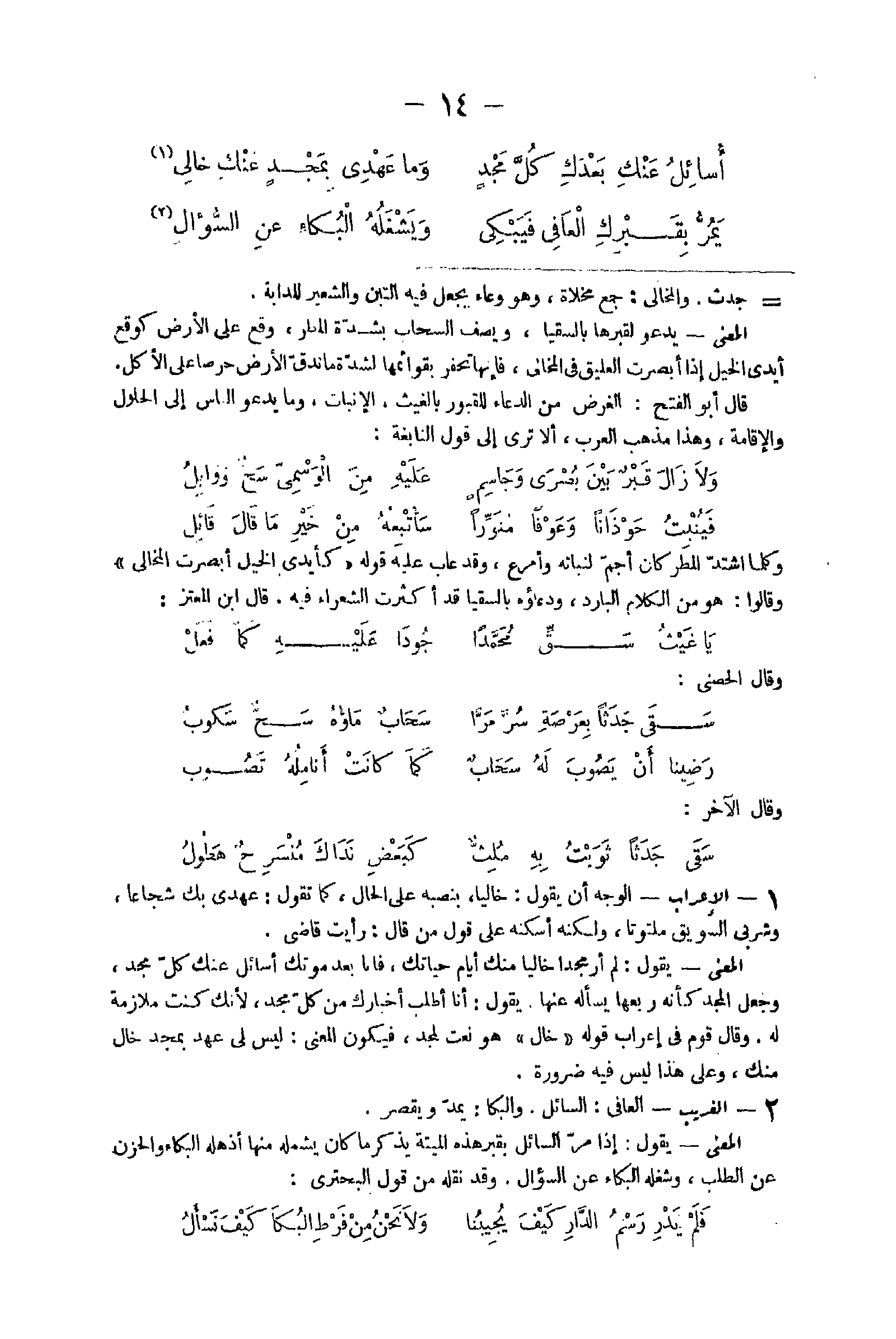19 - الْإِعْرَاب الْوَجْه أَن يَقُول خَالِيا بنصبه على الْحَال كَمَا تَقول عهدي بك شجاعا وشربي السويق ملتوتا وَلكنه أسْكنهُ على قَول من قَالَ رَأَيْت قَاضِي الْمَعْنى يَقُول لم أر مجدا خَالِيا مِنْك أَيَّام حياتك فَأَنا بعد موتك أسائل عَنْك كل مجد وَجعل الْمجد كَأَنَّهُ ربعهَا يسْأَله عَنْهَا يَقُول أَنا أطلب أخبارك من كل مجد لِأَنَّك كنت مُلَازمَة لَهُ وَقَالَ قوم فِي إِعْرَاب قَوْله خَال هُوَ نعت لمجد فَيكون الْمَعْنى لَيْسَ عهد بمجد خَال مِنْك وعَلى هَذَا لَيْسَ فِيهِ ضَرُورَة