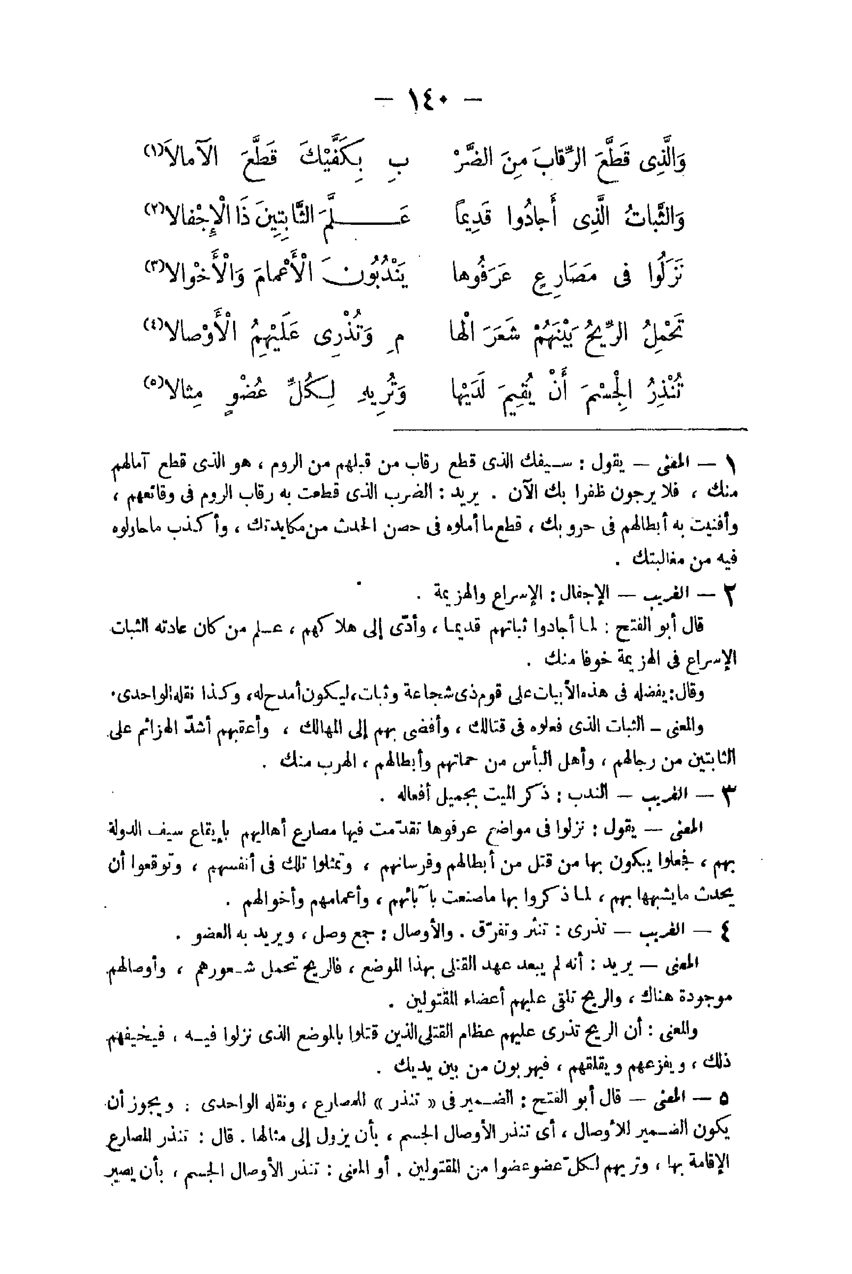 22 - الْغَرِيب الإجفال الْإِسْرَاع والهزيمة _ قَالَ أَبُو الْفَتْح لما أجادوا ثباتهم قَدِيما وَأدّى إِلَى هلاكهم علم من كَانَ عَادَته الثَّبَات الْإِسْرَاع فِي الْهَزِيمَة خوفًا مِنْك وَقَالَ يفضله فِي هَذِه الأبيات على قوم ذِي شجاعة وثبات ليَكُون أمدح لَهُ وَكَذَا نَقله الواحدي وَالْمعْنَى الثَّبَات الَّذِي فَعَلُوهُ فِي قتالك وأفضى بهم إِلَى المهالك وأعقبهم أَشد الهزائم علم الثابتين من رِجَالهمْ وَأهل الْبَأْس من حماتهم وأبطالهم الْهَرَب مِنْك
