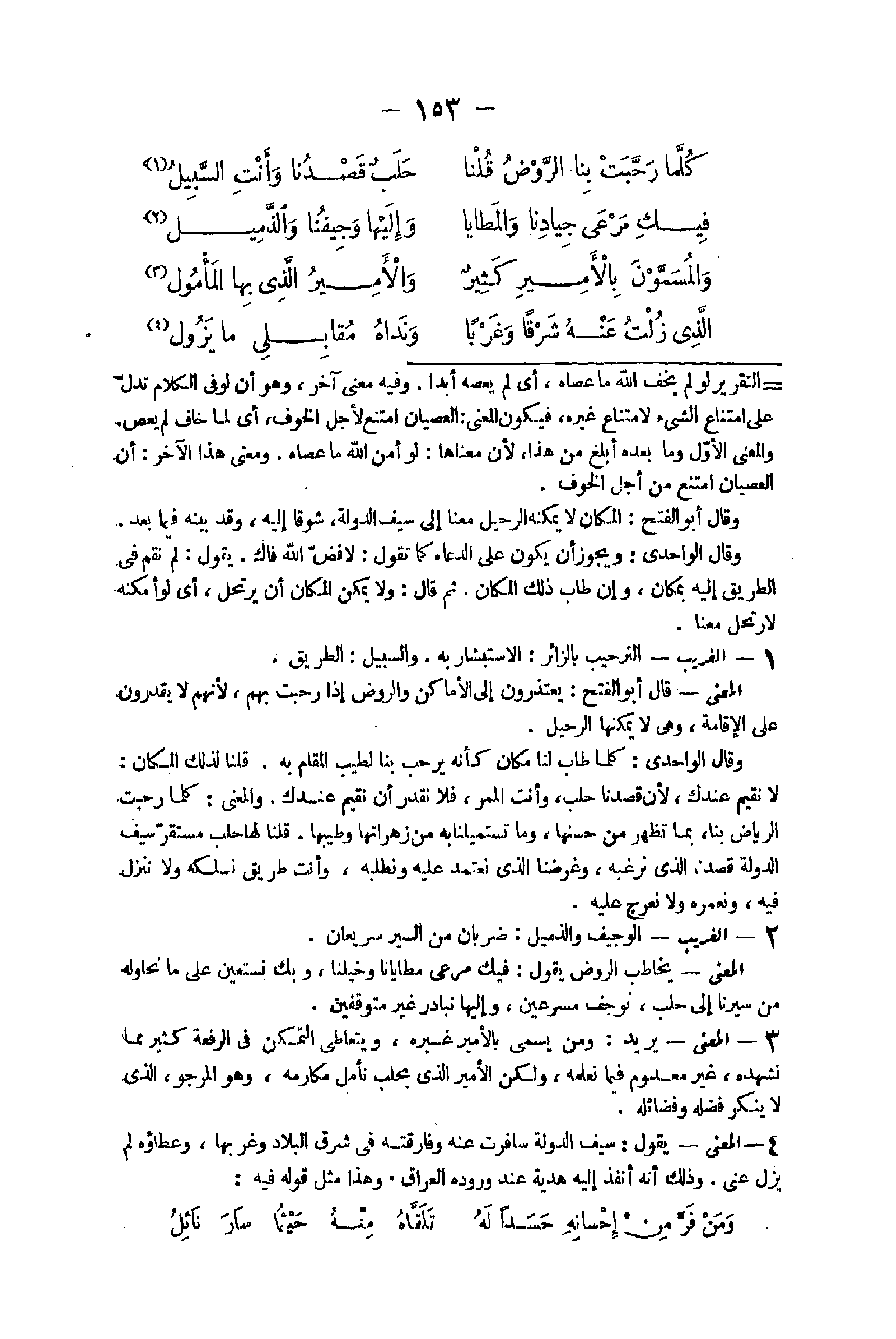 16 - الْغَرِيب الترحيب بالزائر الاستبشار بِهِ والسبيل الطَّرِيق _ الْمَعْنى قَالَ أَبُو الْفَتْح يَعْتَذِرُونَ إِلَى الْأَمَاكِن وَالرَّوْض إِذا رَحبَتْ بهم لأَنهم لَا يقدرُونَ على الْإِقَامَة وَهِي لَا يُمكنهَا الرحيل _ وَقَالَ الواحدي كلما طَابَ لنا مَكَان كَأَنَّهُ يرحب بِنَا لطيب الْمقَام بِهِ قُلْنَا لذَلِك الْمَكَان لَا نُقِيم عنْدك لِأَن قصدنا حلب وَأَنت الْمَمَر فَلَا نقدر أَن نُقِيم عنْدك وَالْمعْنَى كلما رَحبَتْ الرياض بِنَا بِمَا تظهر من حسنها وَمَا تستميلنا بِهِ من زهراتها وطيبها قُلْنَا لَهَا حلب مُسْتَقر سيف الدولة فصدنا الَّذِي نرغبه وغرضنا الَّذِي نعتمد عَلَيْهِ ونطلبه وَأَنت طَرِيق نسلكه وَلَا ننزل فِيهِ ونعمره وَلَا نعرج عَلَيْهِ