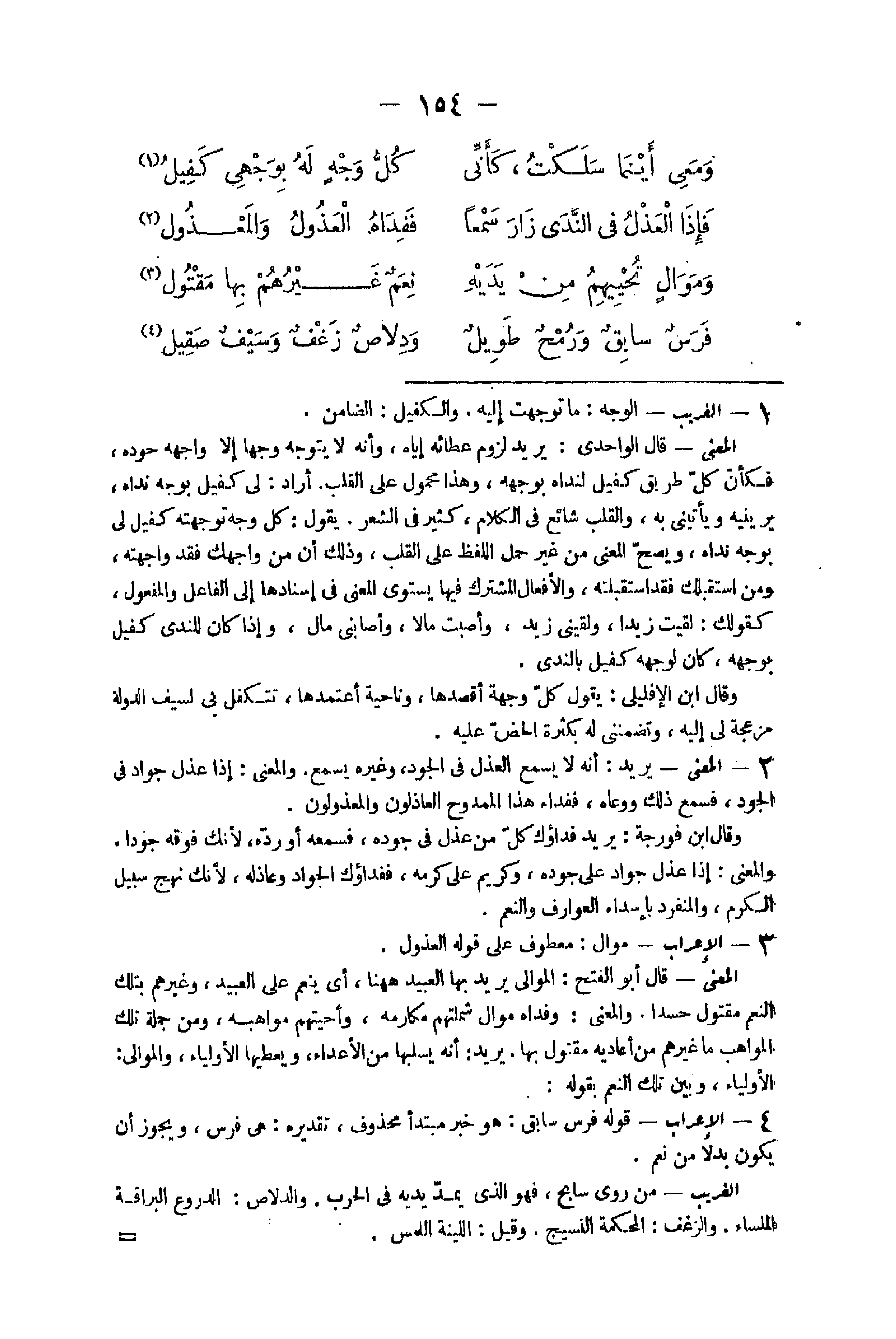 - الْغَرِيب الْوَجْه مَا تَوَجَّهت إِلَيْهِ وَالْكَفِيل الضَّامِن _ الْمَعْنى قَالَ الواحدي يُرِيد لُزُوم عطائه إِيَّاه وَأَنه لَا يتَوَجَّه وَجها إِلَّا واجهه جوده فَكَأَن كل طَرِيق كَفِيل لنداه بِوَجْهِهِ وَهَذَا مَحْمُول على الْقلب أَرَادَ لي كَفِيل بِوَجْه نداه يرينيه وياتيني بِهِ وَالْقلب شَائِع فِي الْكَلَام كثير فِي الشّعْر يَقُول كل وَجه توجهته كَفِيل لي يُوَجه نداه وَيصِح الْمَعْنى من غير حمل اللَّفْظ على الْقلب وَذَلِكَ أَن مِمَّن واجهك فقد واجهته وَمن استقبلك فقد استقبلته وَالْأَفْعَال الْمُشْتَرك فِيهَا يَسْتَوِي الْمَعْنى فِي إسنادها إِلَى الْفَاعِل وَالْمَفْعُول كَقَوْلِك لقِيت زيدا ولقيني زيد وأصبت مَالا وأصابني مَال وَإِذا كَانَ للندى كَفِيل بِوَجْهِهِ كَانَ لوجهه كَفِيل بالندى وَقَالَ ابْن الإفليلي يَقُول كل وجهة أقصدها وناحية اعتمدها تتكفل بِي لسيف الدولة مزعجة لي إِلَيْهِ وتضمني لَهُ بِكَثْرَة الحض عَلَيْهِ