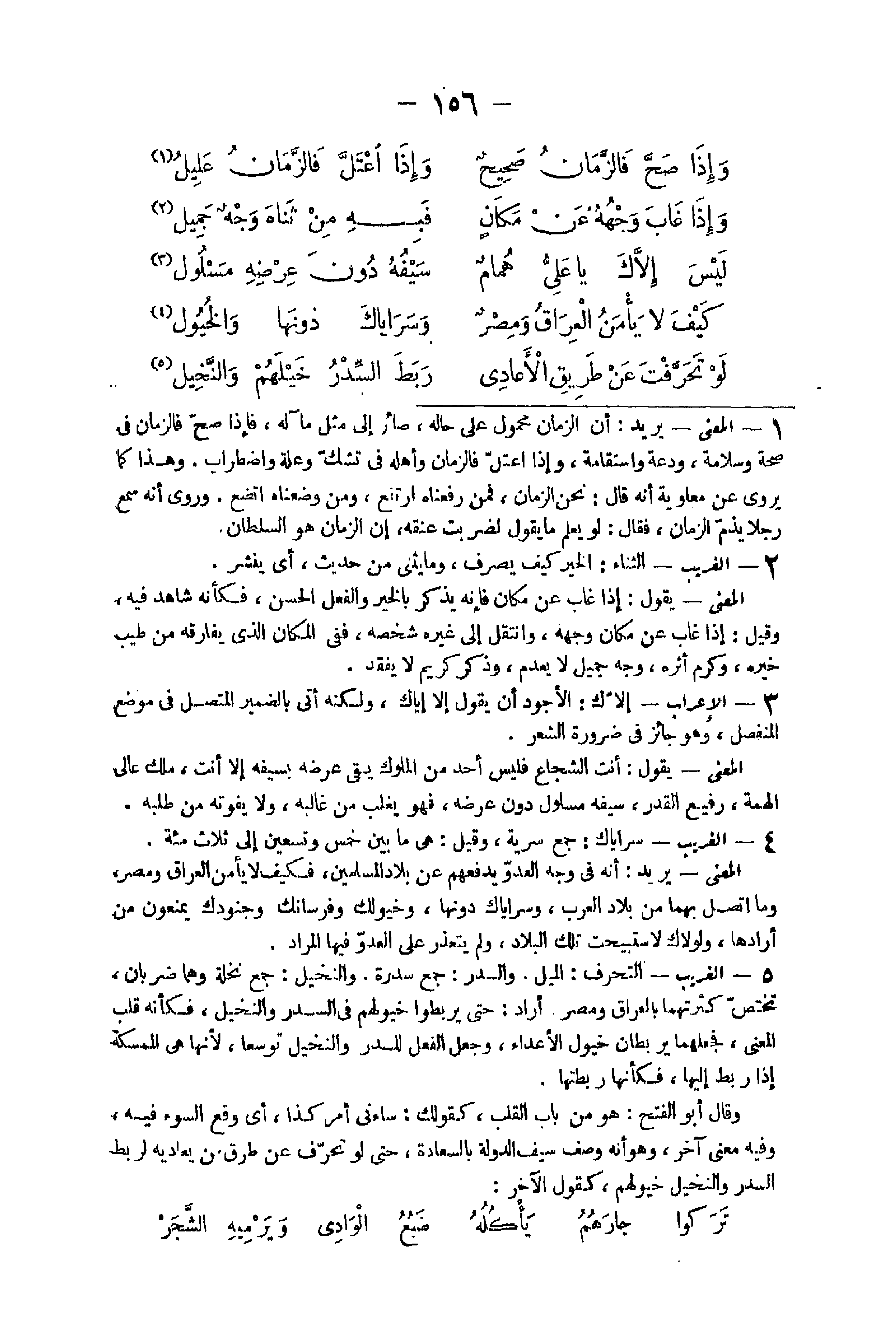 32 - الْغَرِيب التحرف الْميل والسدر جمع سِدْرَة والنخيل جمع نَخْلَة وهما ضَرْبَان تخْتَص كثرتهما بالعراق ومصر أَرَادَ حَتَّى يربطوا خيولهم فِي السدر والنخيل فَكَأَنَّهُ قلب الْمَعْنى فجعهما يربطان خُيُول الْأَعْدَاء وَجعل الْفِعْل للسدر والنخيل توسعا الأنها هِيَ الممسكة إِذا ربط إِلَيْهَا فَكَأَنَّهَا ربطتها وَقَالَ أَبُو الْفَتْح هُوَ من بَاب الْقلب كَقَوْلِك سَاءَنِي أَمر كَذَا أَي وَقع السوء فِيهِ وَفِيه معنى آخر وَهُوَ أَنه وصف سيف الدولة بالسعادة حَتَّى لَو تحرف عَن طرق من يعاديه لربط السدر والنخيل خيولهم كَقَوْل الآخر