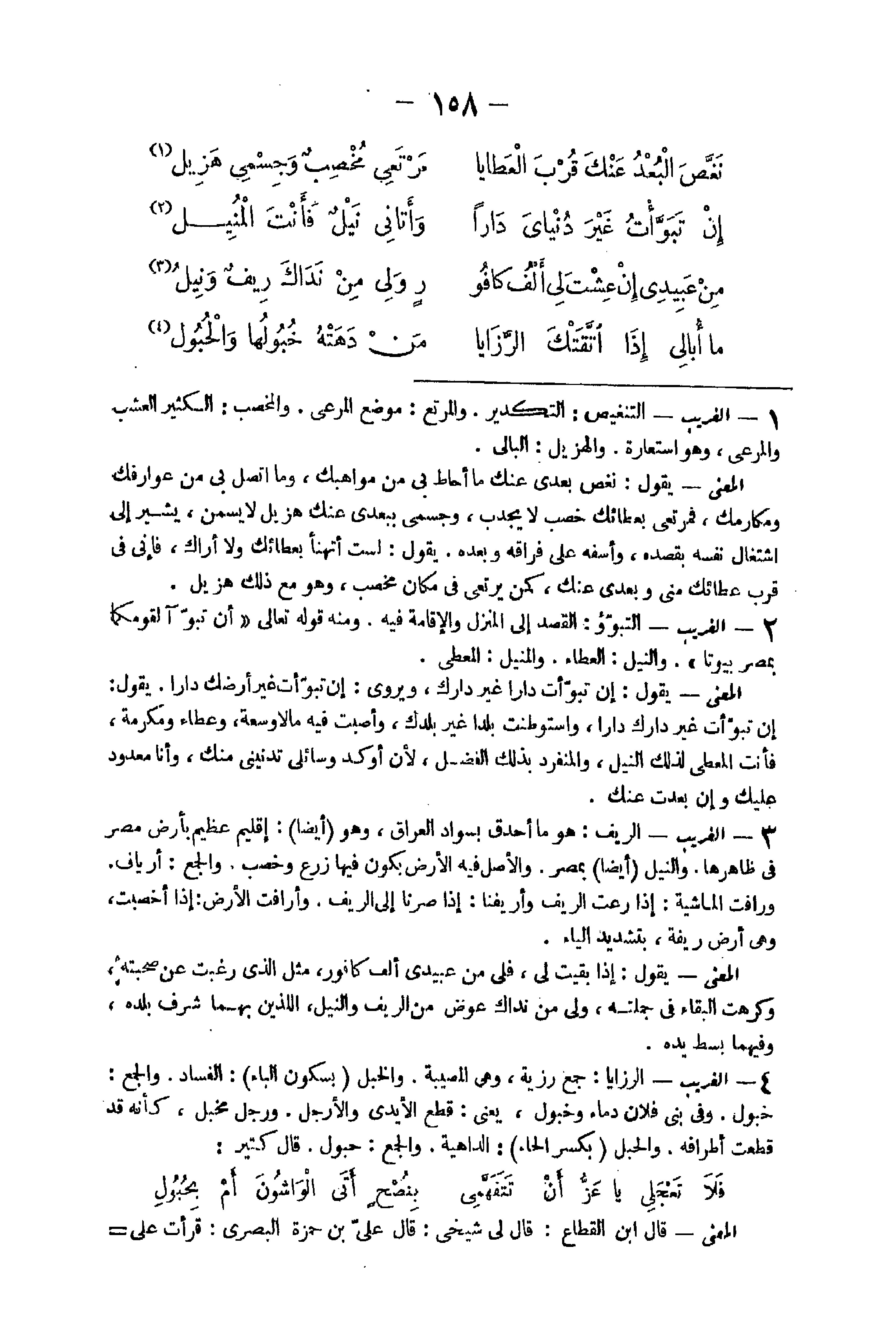 - الْغَرِيب التنغيص التكدير والمرتع مَوضِع المرعى والمخصب الْكثير العشب والمرعى وَهُوَ اسْتِعَارَة والهزيل الْبَالِي الْمَعْنى يَقُول نغص بعدِي عَنْك مَا أحَاط بِي من مواهبك وَمَا اتَّصل بِي من عوارفك ومكارمك فمرتعي بِعَطَائِك خصب لَا يجدب وجسمي ببعدي عَنْك هزيل لَا يسمن يُشِير إِلَى اشْتِغَال نَفسه بِقَصْدِهِ وأسفه على فِرَاقه وَبعده يَقُول لست أتهنأ بِعَطَائِك وَلَا أَرَاك فَإِنِّي فِي قرب عطائك مني وبعدي عَنْك كمن يرتعي فِي مَكَان مخصب وَهُوَ مَعَ ذَلِك هزيل
