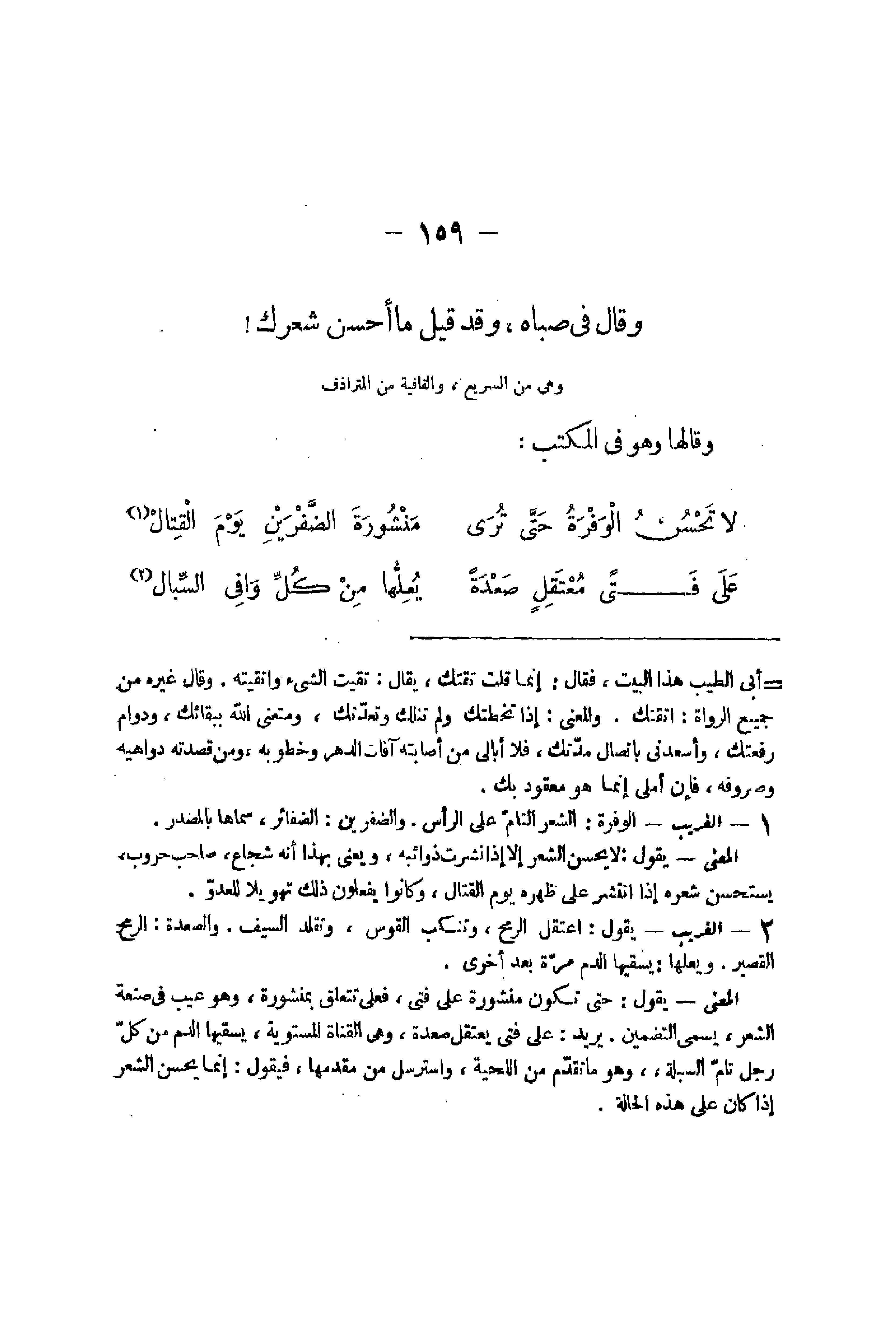 - 1 الْغَرِيب الوفرة الشّعْر التَّام على الرَّأْس الضفرين الضفائر سَمَّاهَا بِالْمَصْدَرِ الْمَعْنى يَقُول لَا يحسن الشّعْر إِلَّا إِذا نشرت ذوائبه وَيَعْنِي بِهَذَا أَنه شُجَاع صَاحب حروب يستحسن شعره إِذا انْتَشَر على ظَهره يَوْم الْقِتَال وَكَانُوا يَفْعَلُونَ ذَلِك تهويلا لِلْعَدو